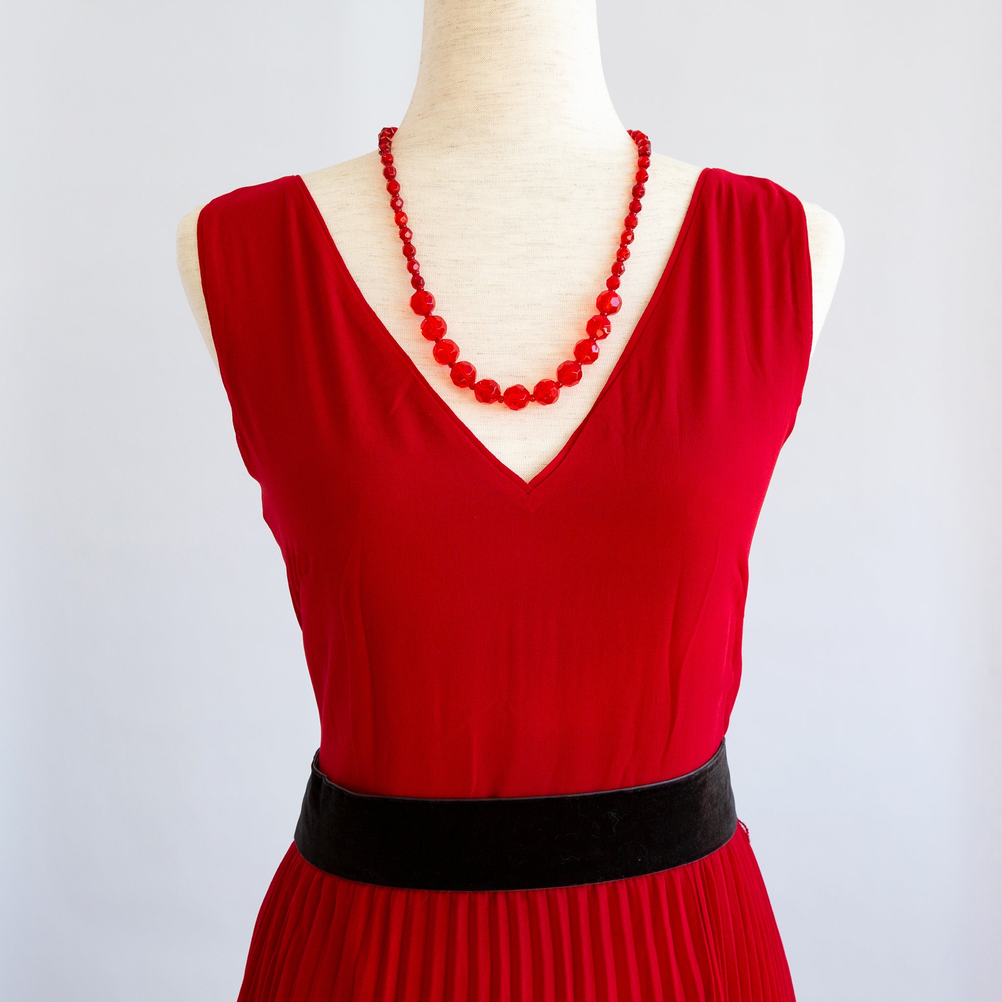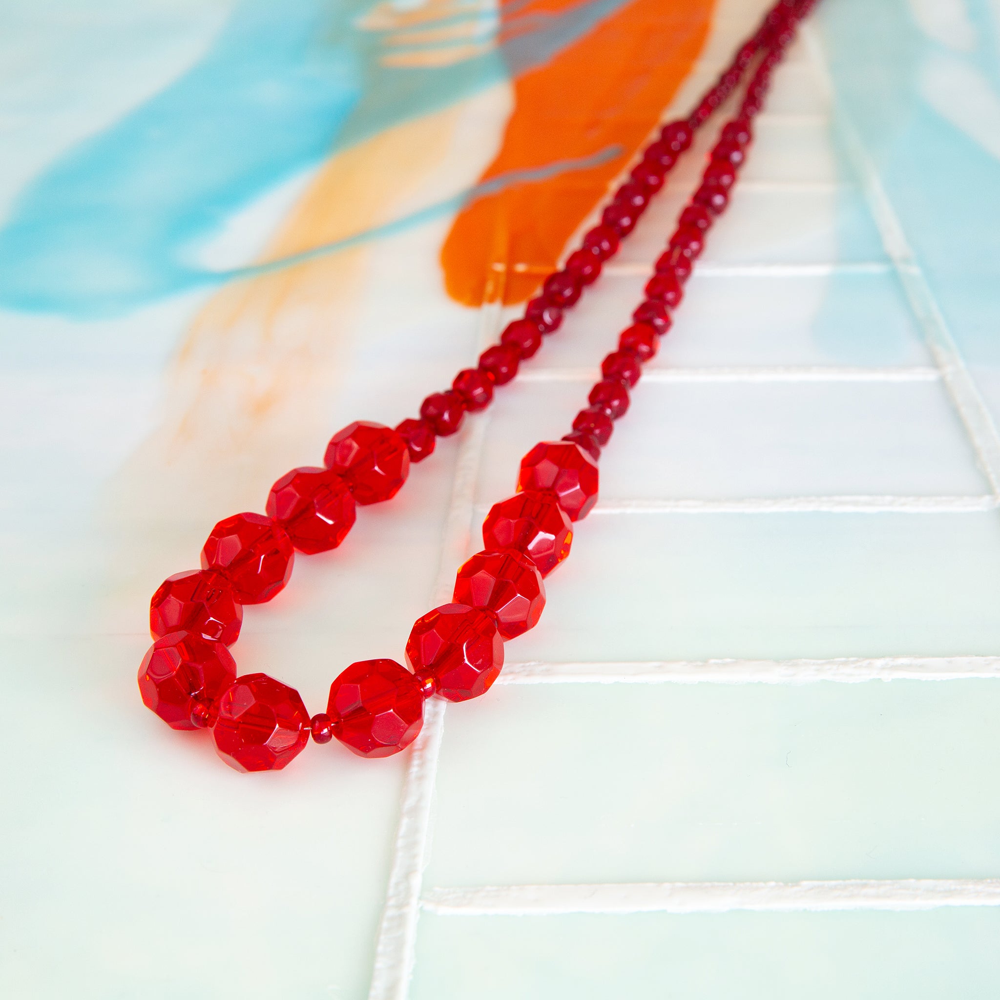 Graduated red transparent beads, clasp and extension.