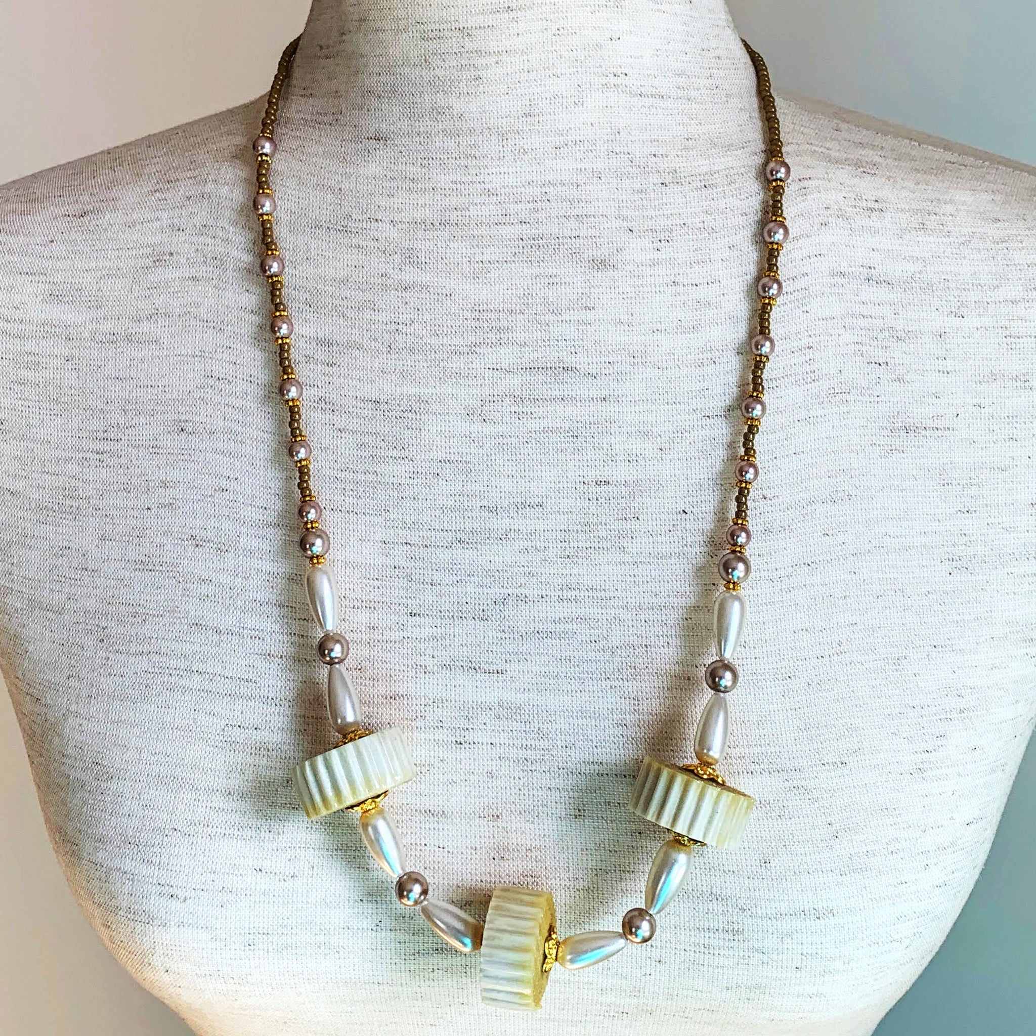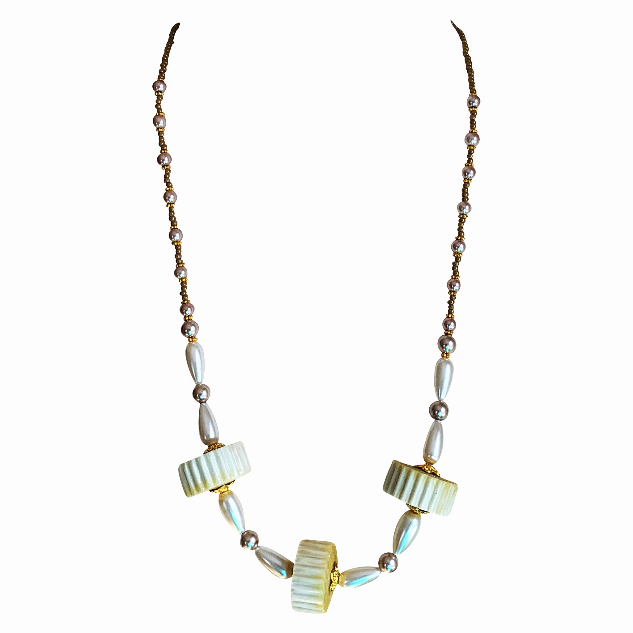 Add radiance to any outfit. The necklace combines handmade paper beads, glass pearls and glass beads, a clasp with extender. Great as a gift for someone you love or for yourself.