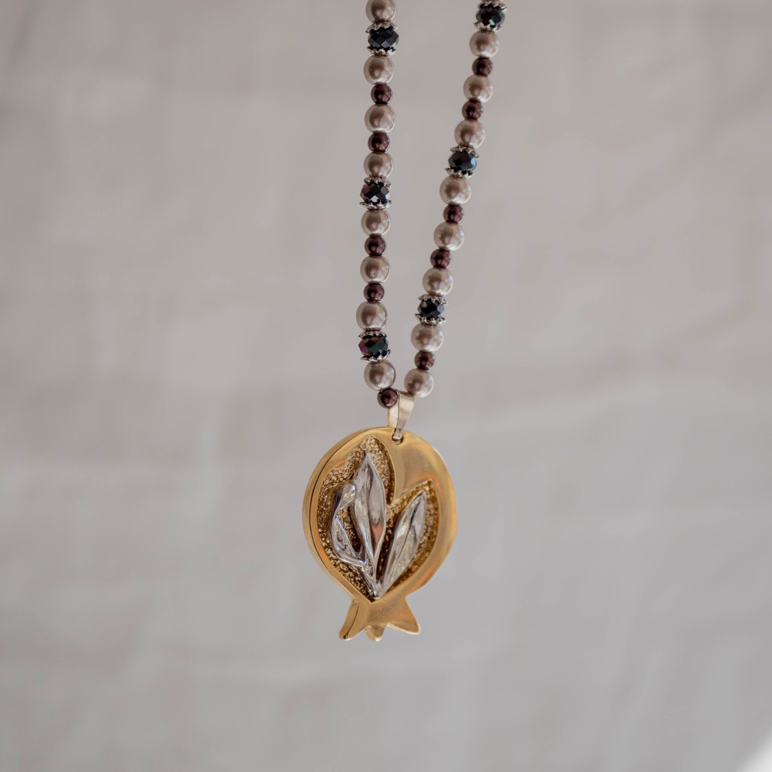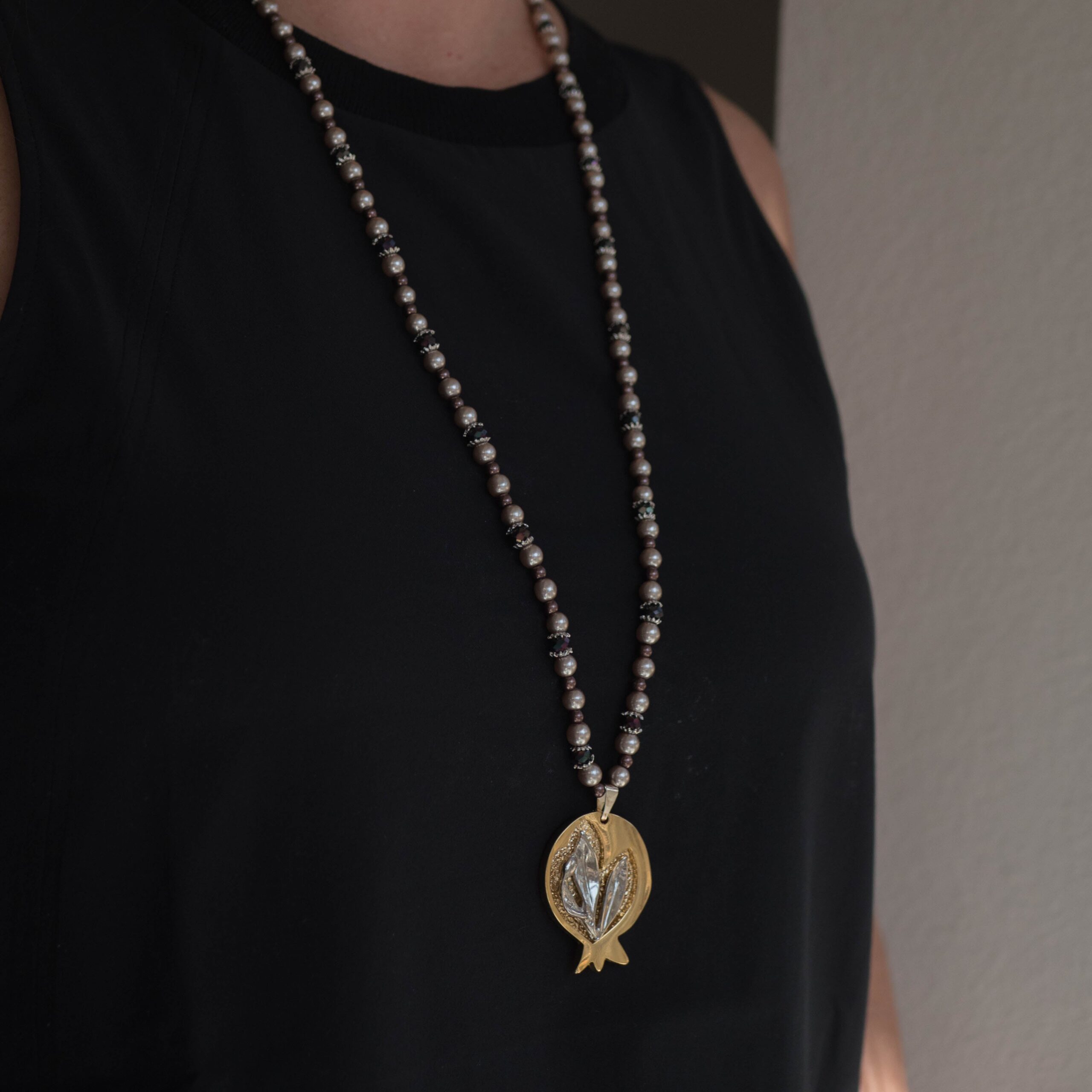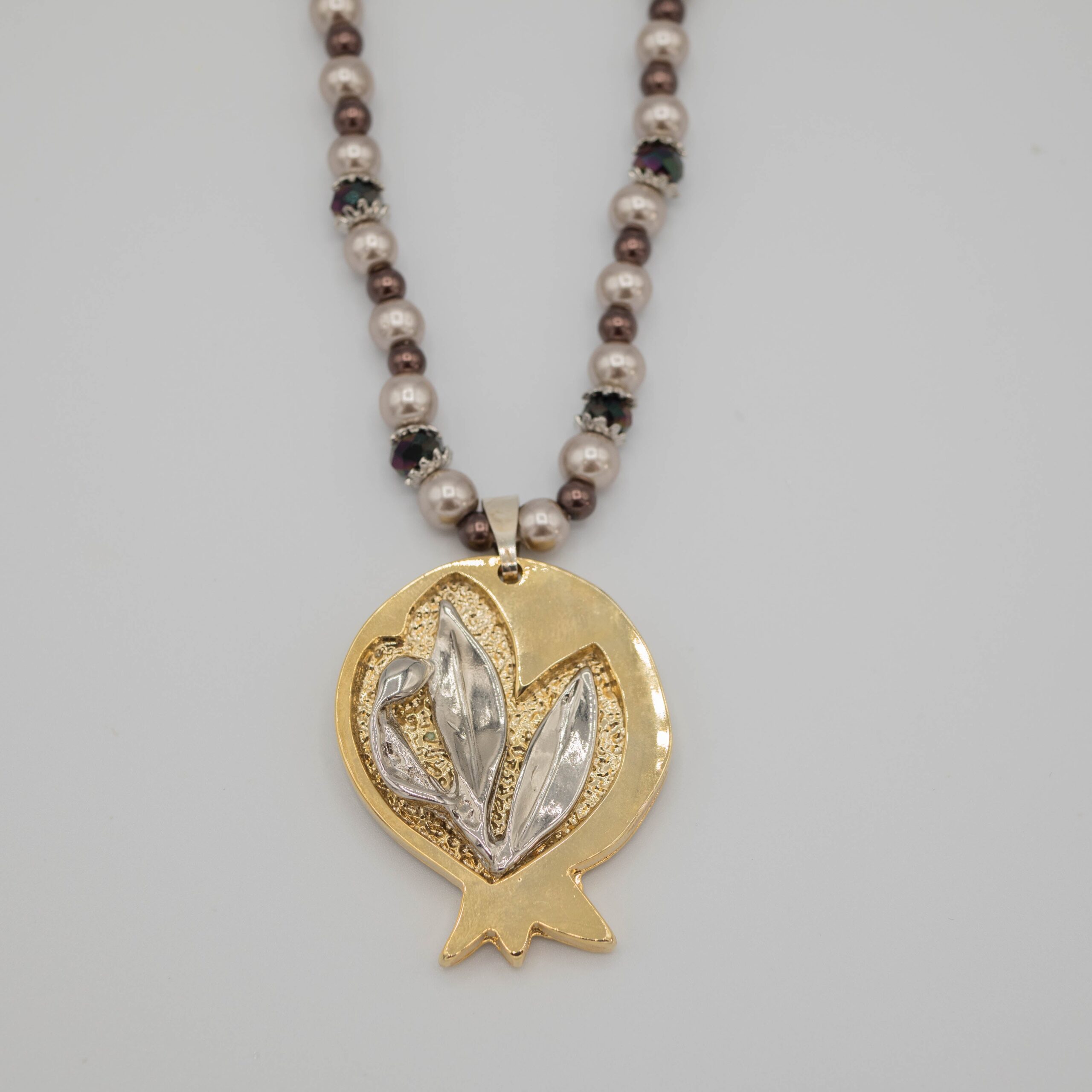 Beautiful ensemble of glass pearls, faceted beads and spacers with a unique gold plated pomegranate pendant base with a silver branch in the center – clasp and extension