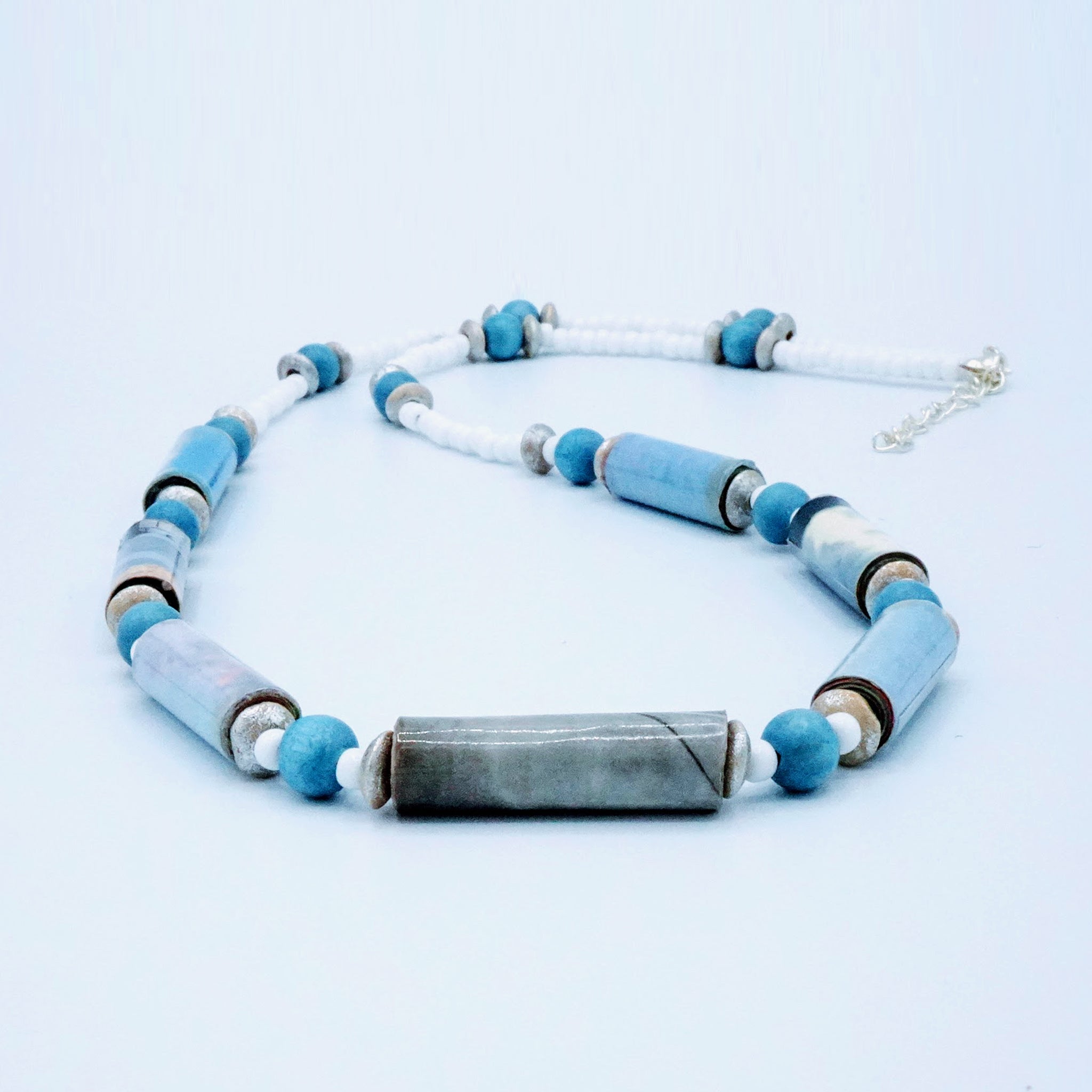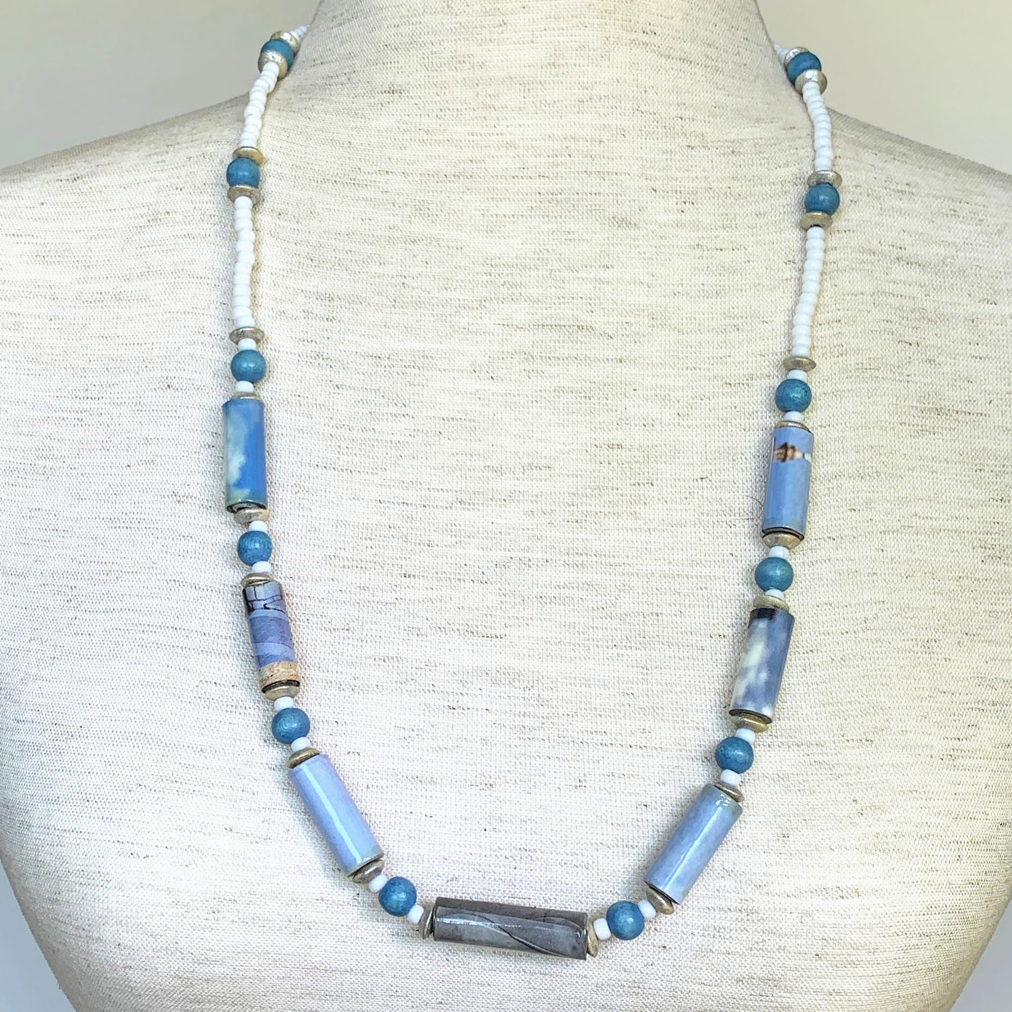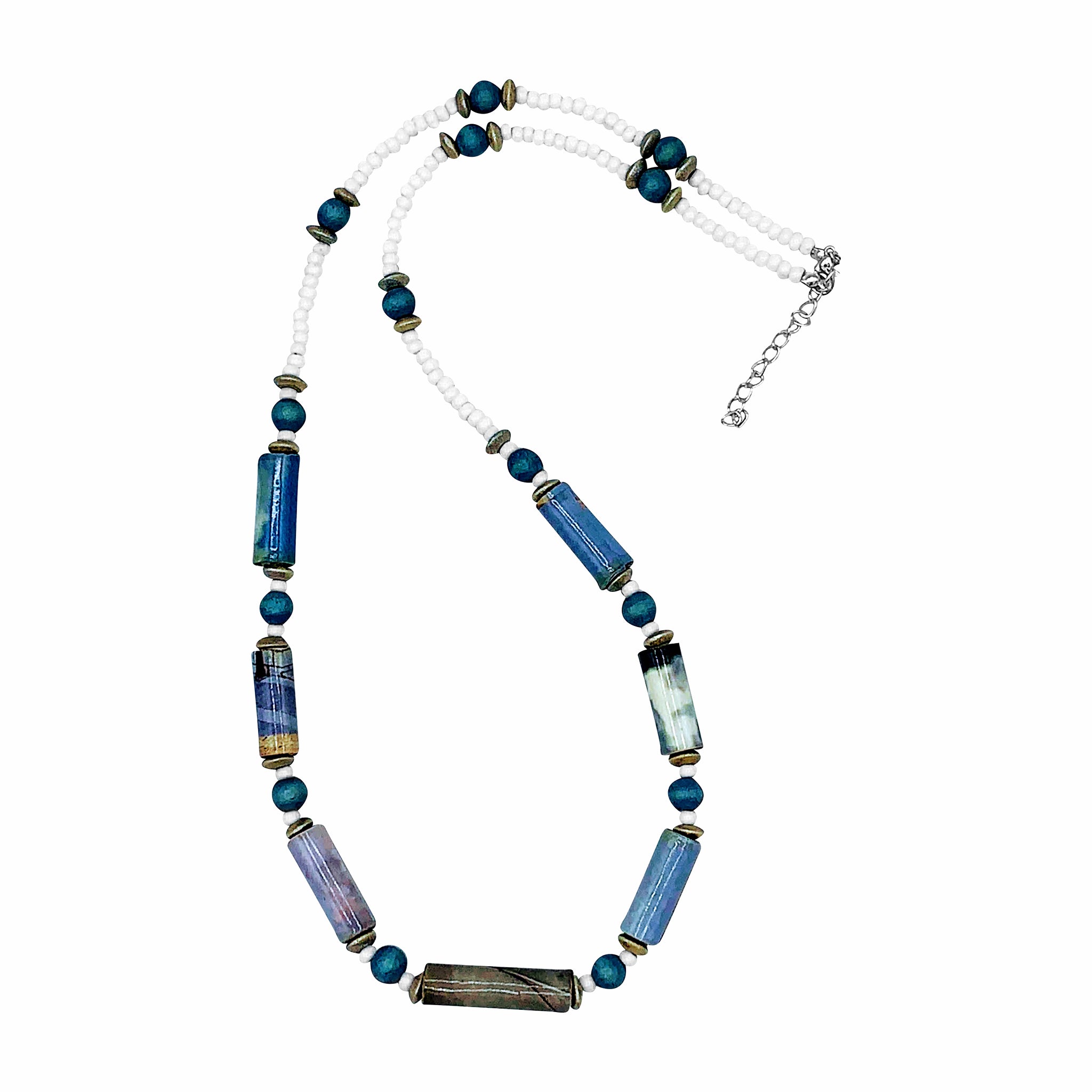Exquisite paper beads, blue and silver-colored wood beads, and glass beads, with silver clasp and extension.