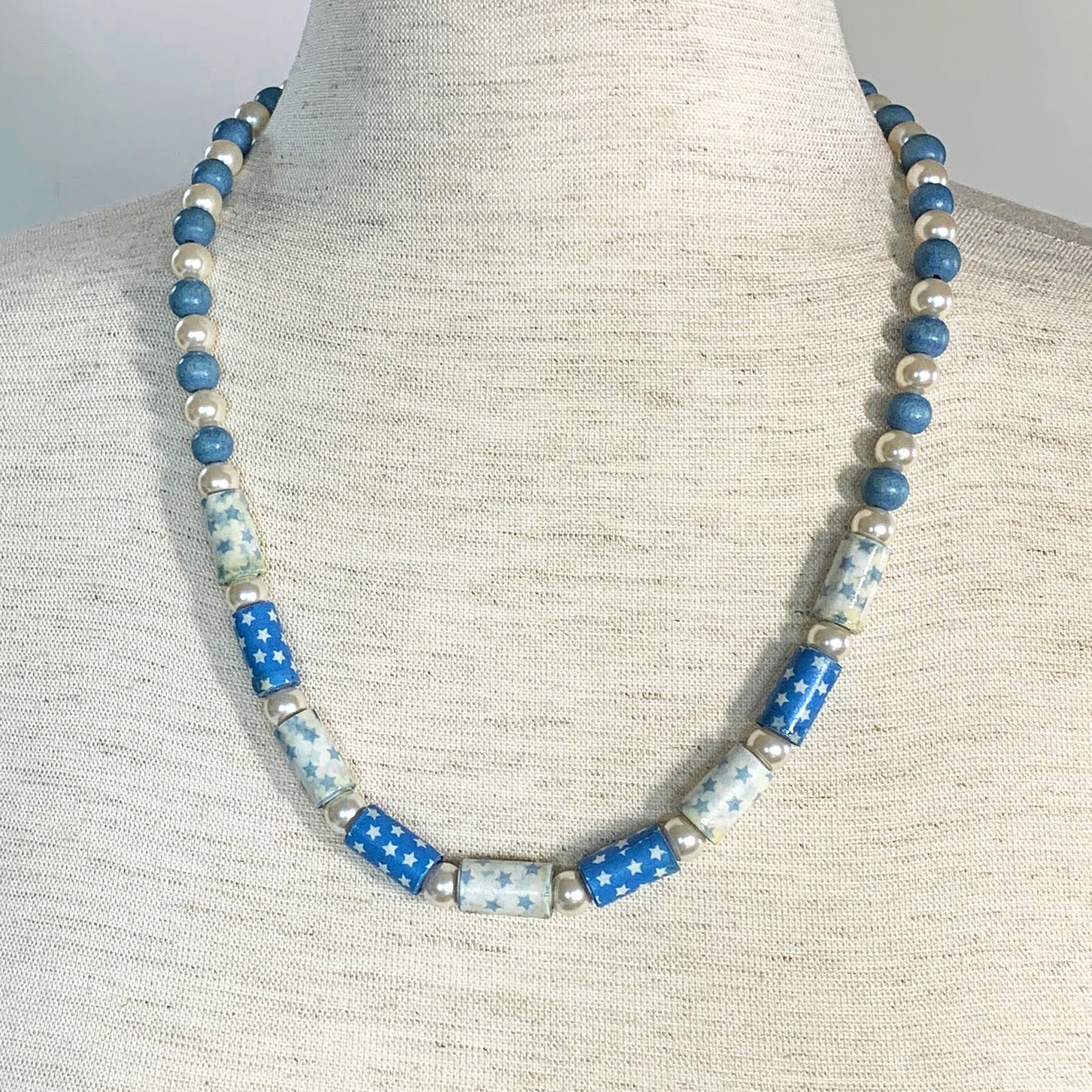 Blue and white with stars necklace can go from dressy to casual with many different outfits. Elegant blue and white paper beads, combined with blue glass and wood beads, clasp with extender.