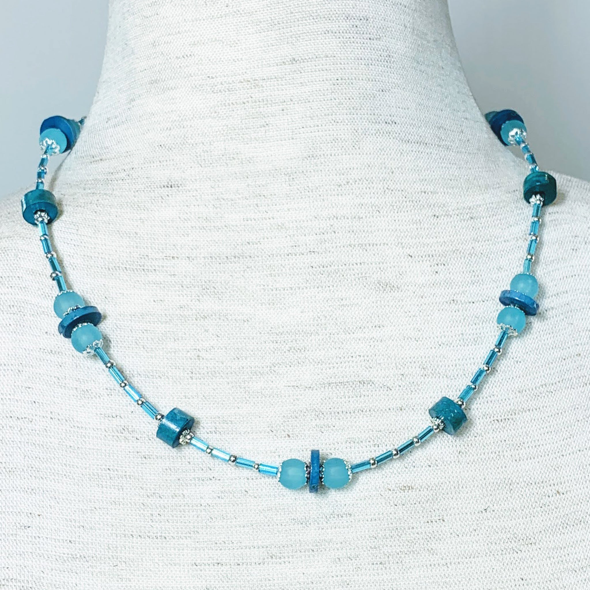 Beautiful Necklace in hues of blue made with paper beads, mixed media, glass beads, silver clasp w chain extension.
