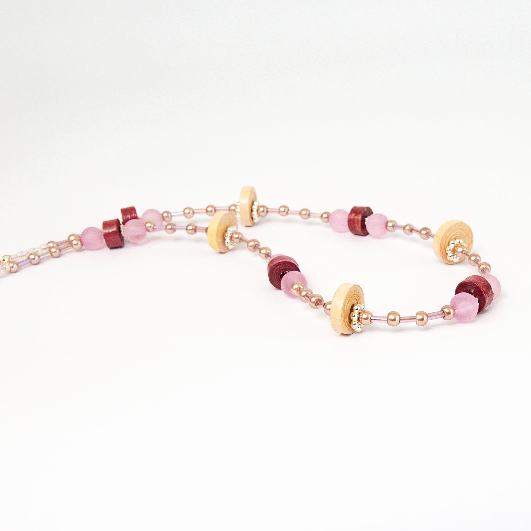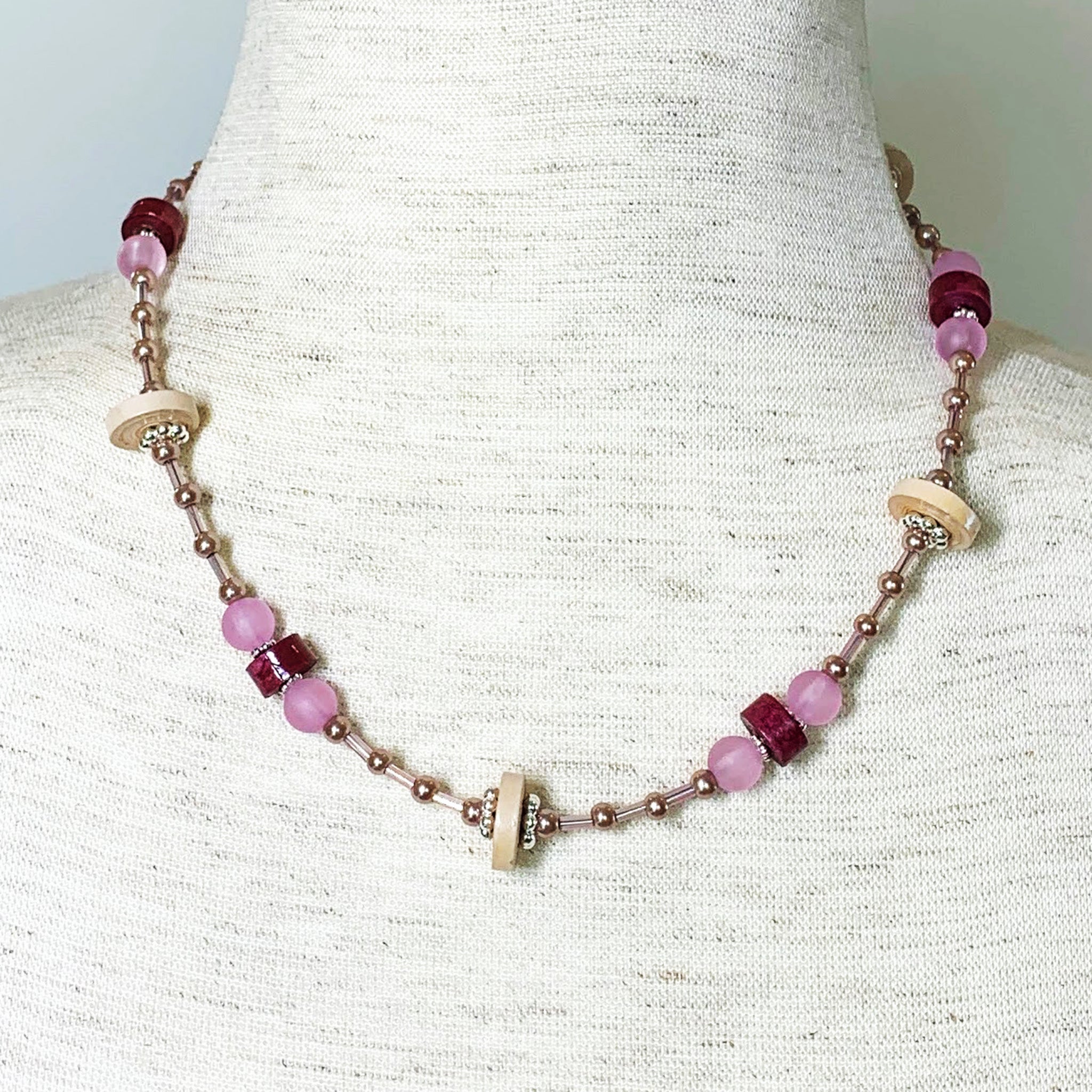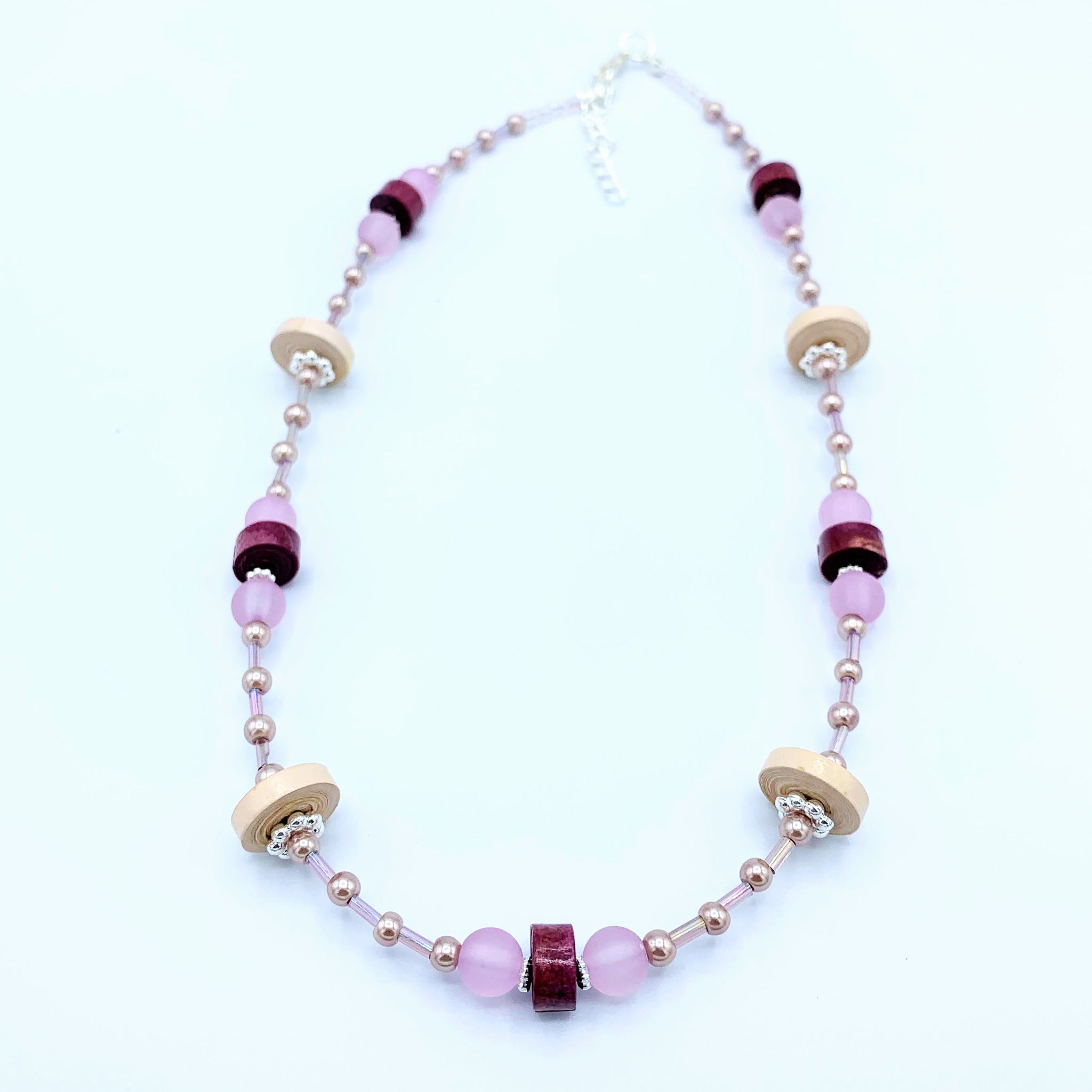 Dainty beige crimson w lavender beads, glass mixed media, clasp and extension