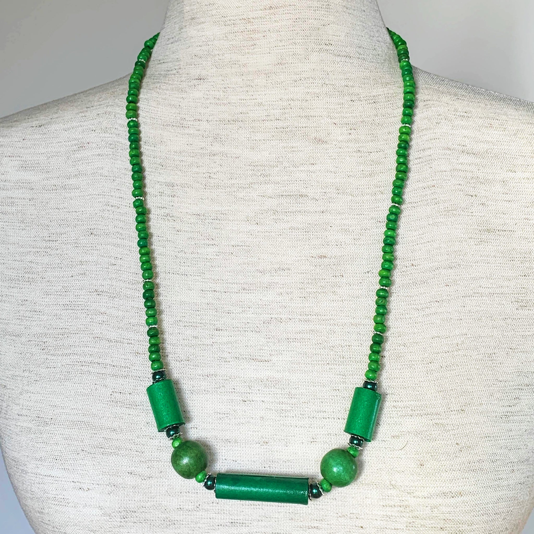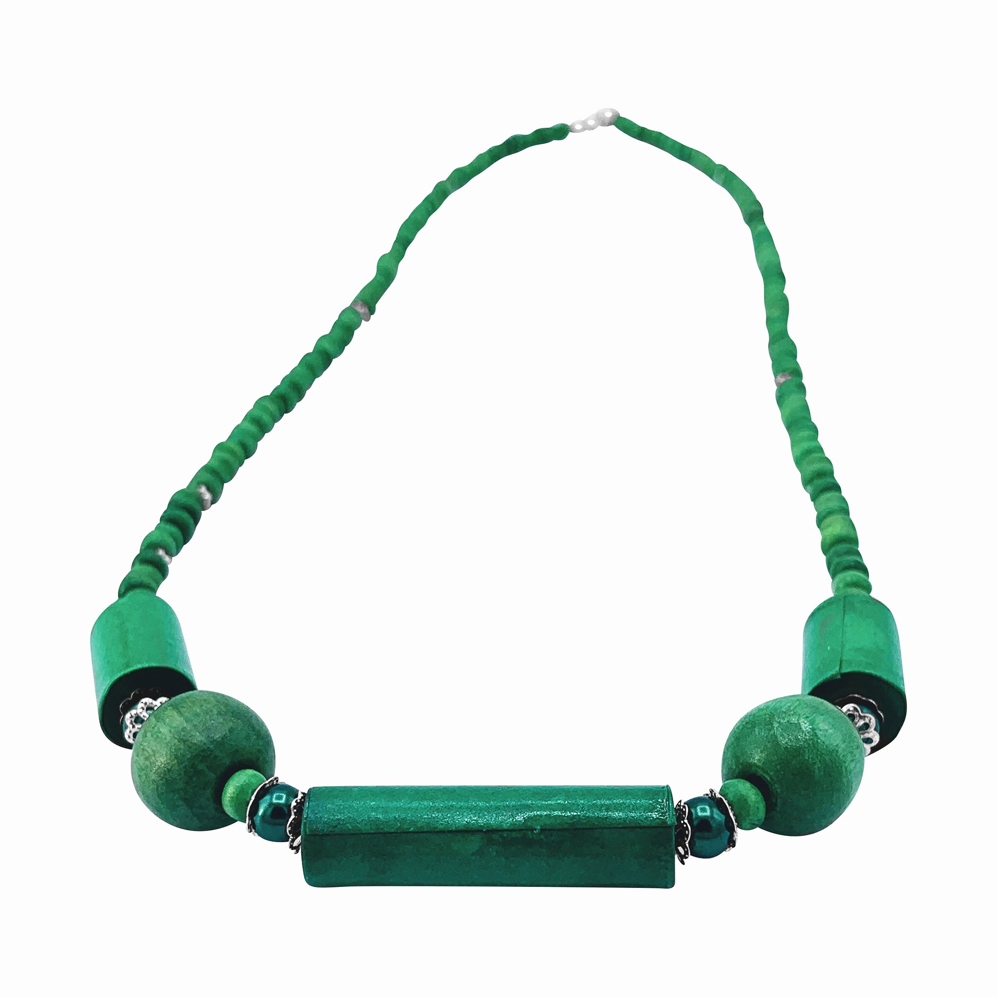Add a unique piece to your jewelry collection with this dark green bold necklace. It combines large green paper beads, wood beads, and glass beads with silver clasp and extender. Excellent for any occasion.