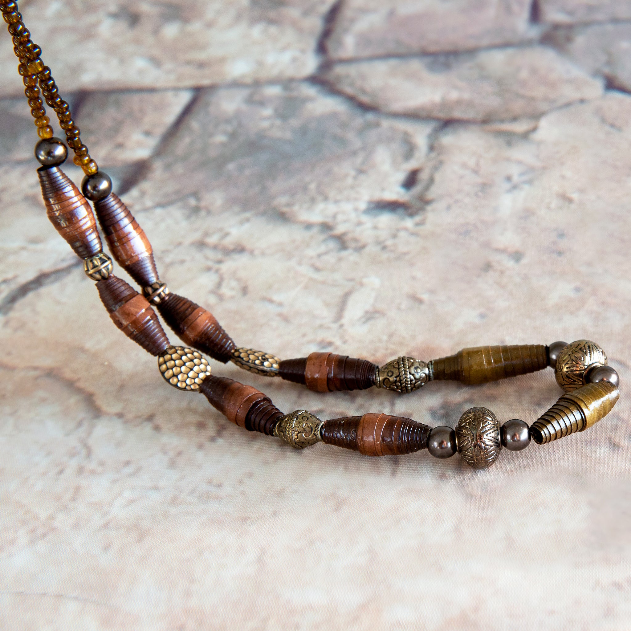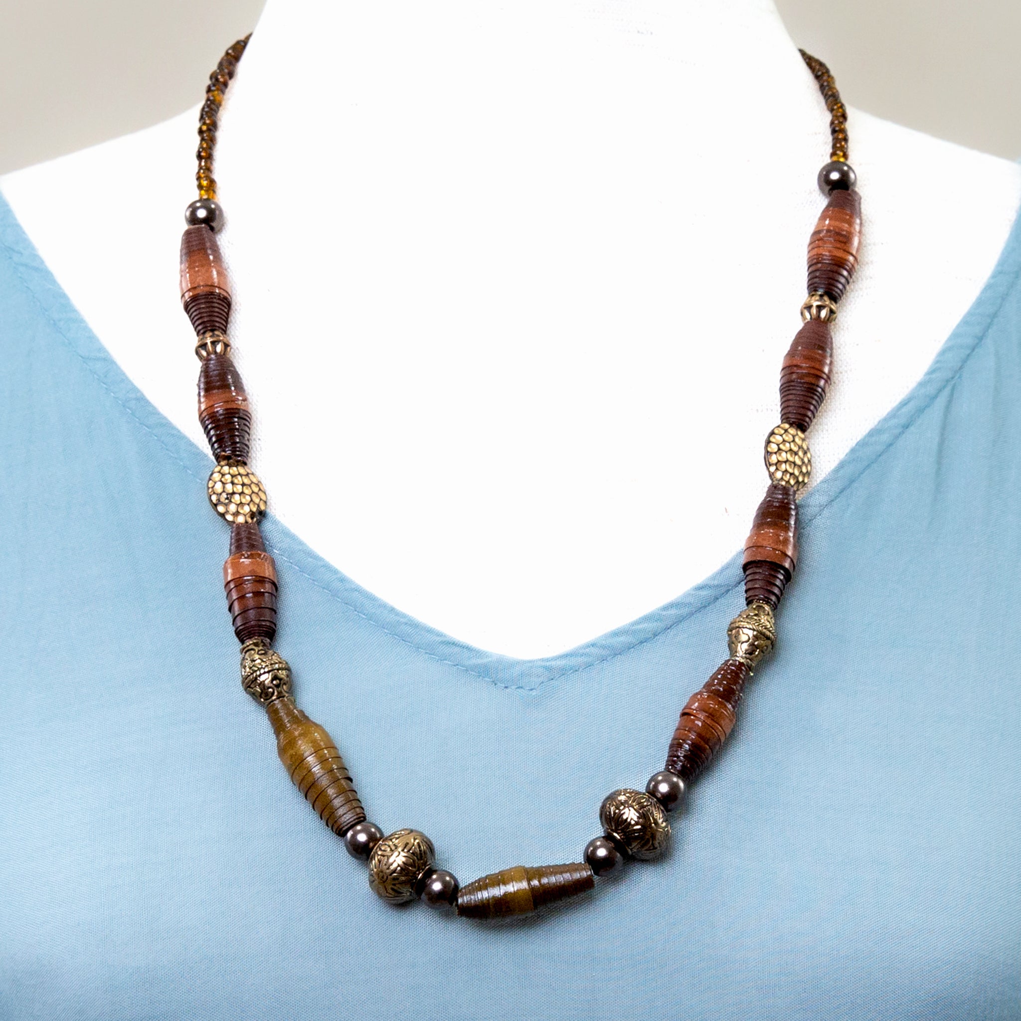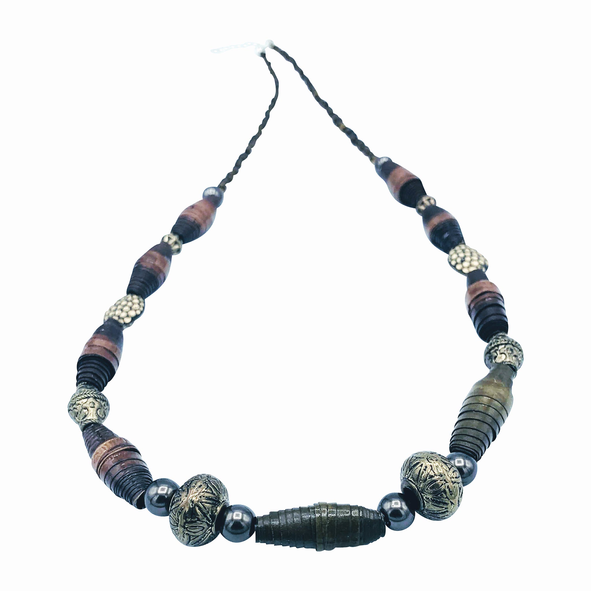 Elegant single-stranded necklace in multi brown hues with large paper beads, glass pearls, metal. and glass beads, with a silver clasp, and chain extension.