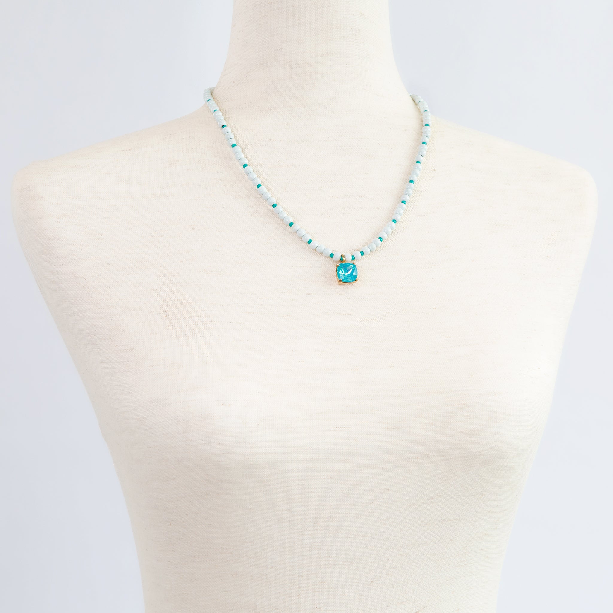 Delicate white wood beads, turquoise beads, spacers w acqua crystal pendant.