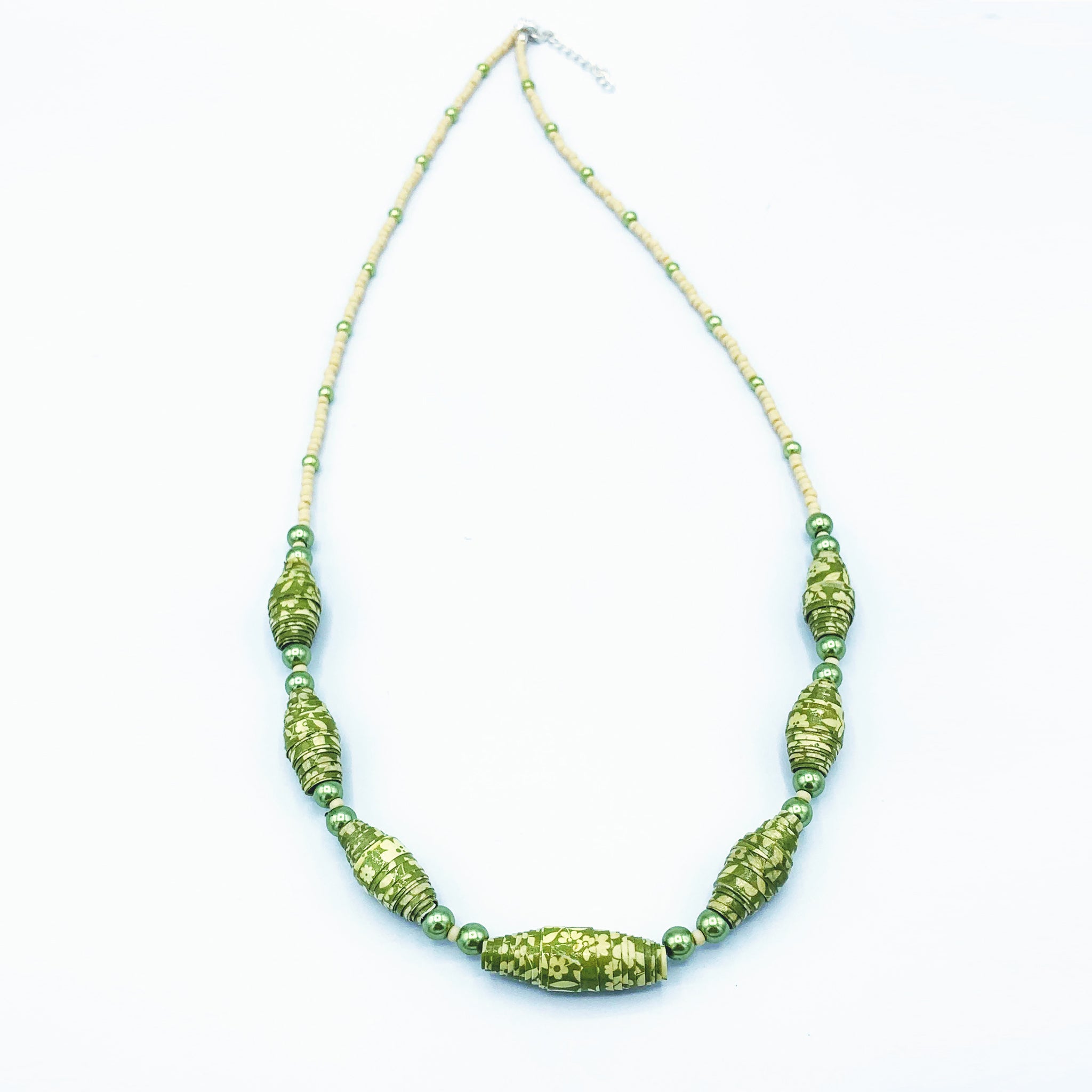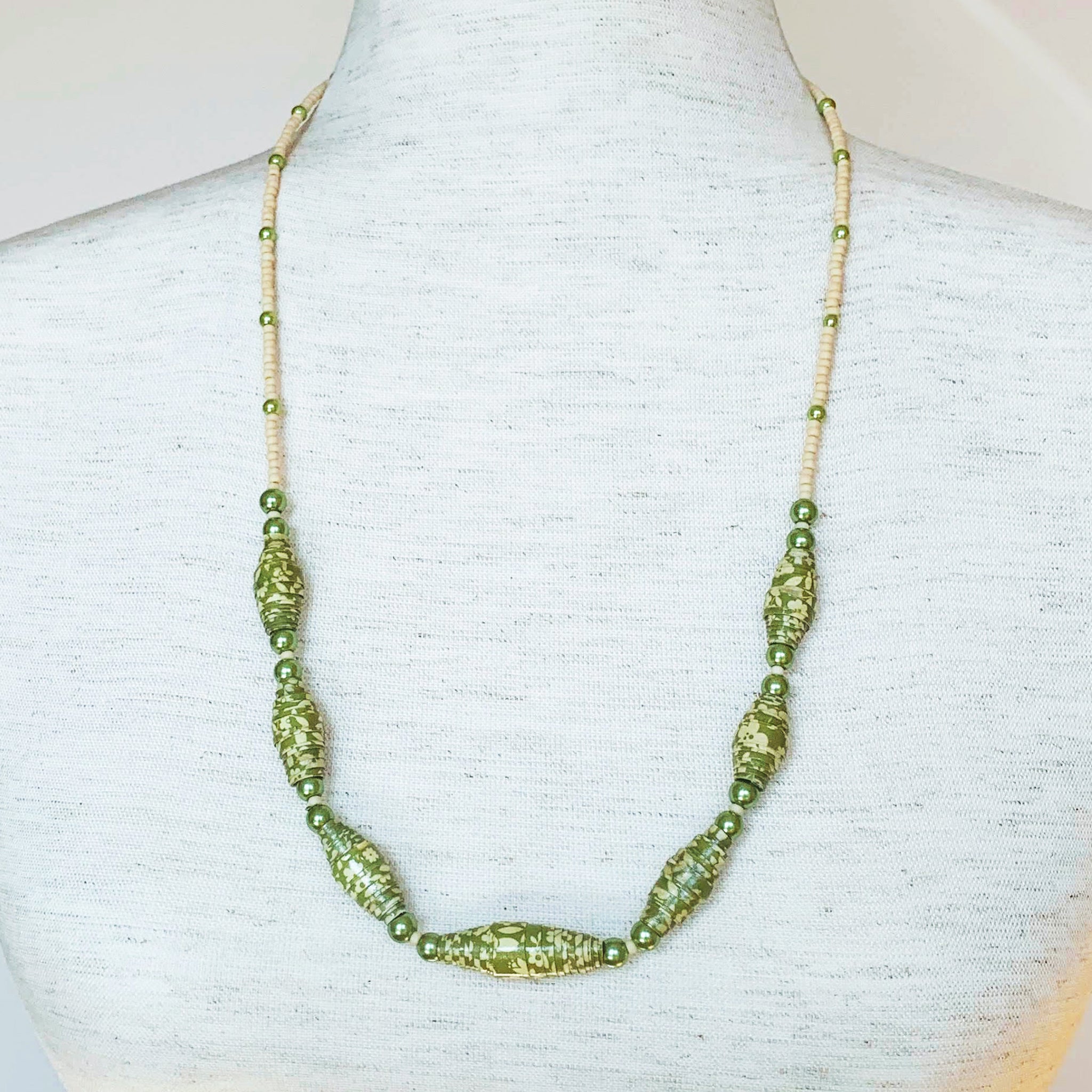This lovely necklace combines handmade green paper beads, glass pearls, and beads, clasp, and extender. A medley of light and dark green beads in a variety of shapes and sizes made into a wearable art with a sophisticated feel.