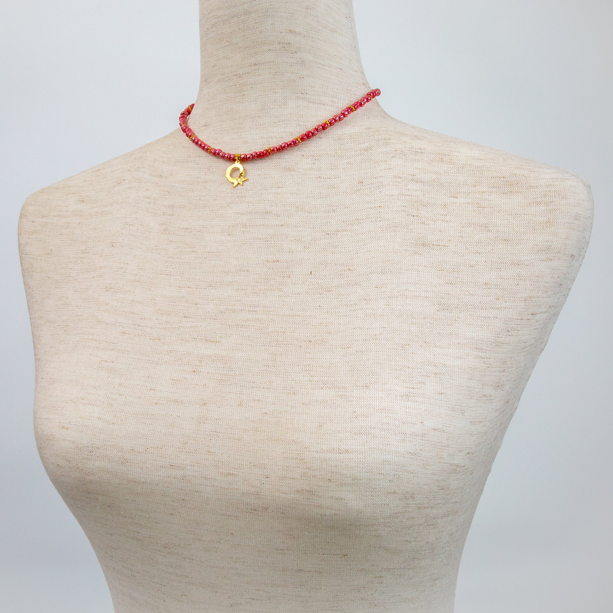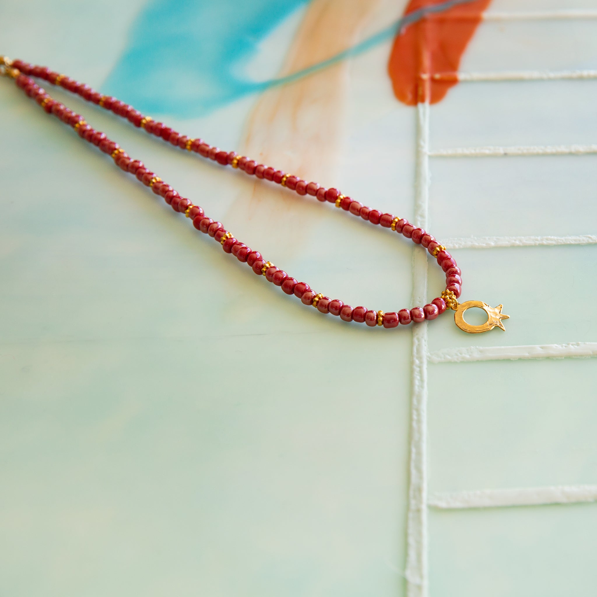 Crimson red bycone crystals, with gold color spacers, 14K gold plated pomegranate. You can layer it with other necklaces to make it even more chic!