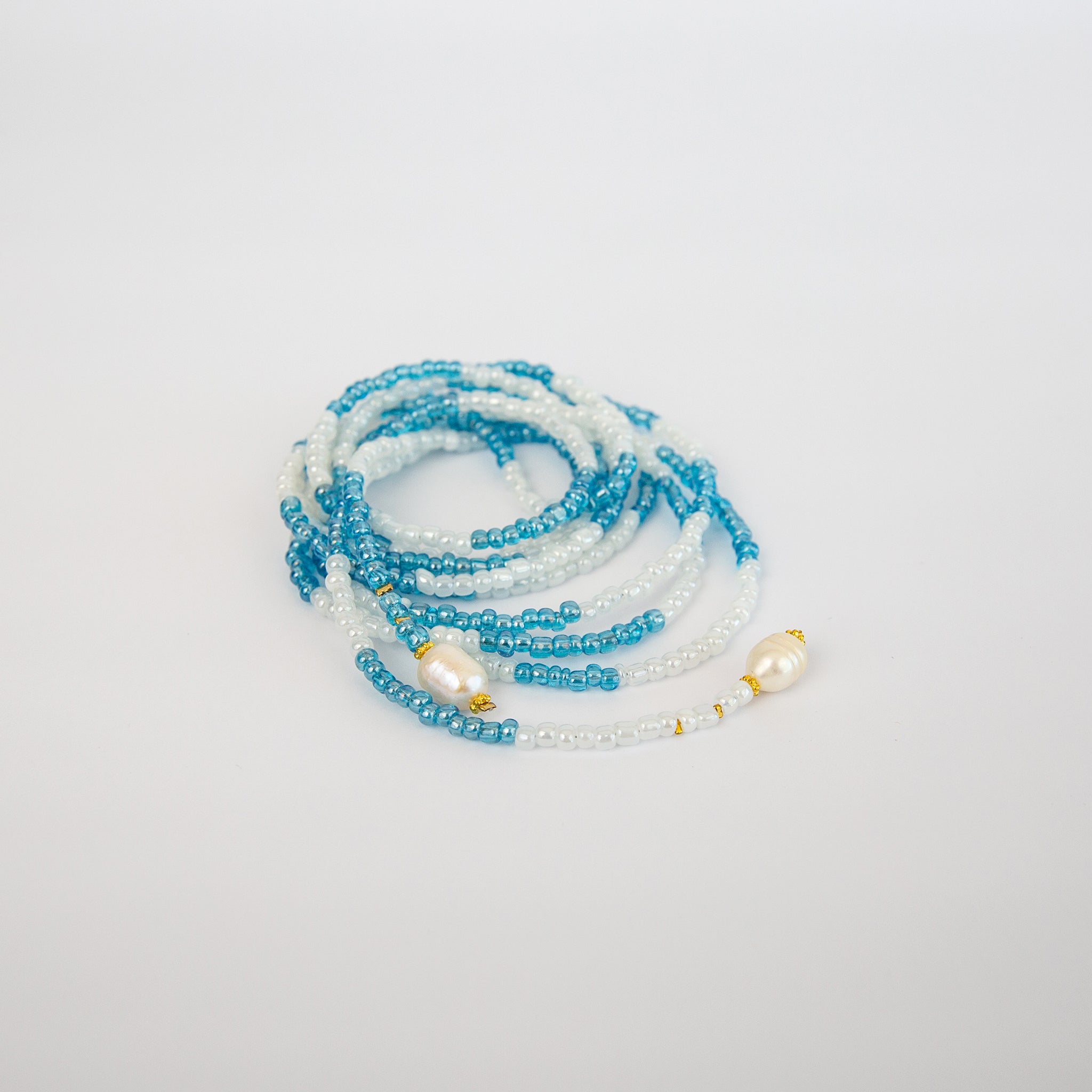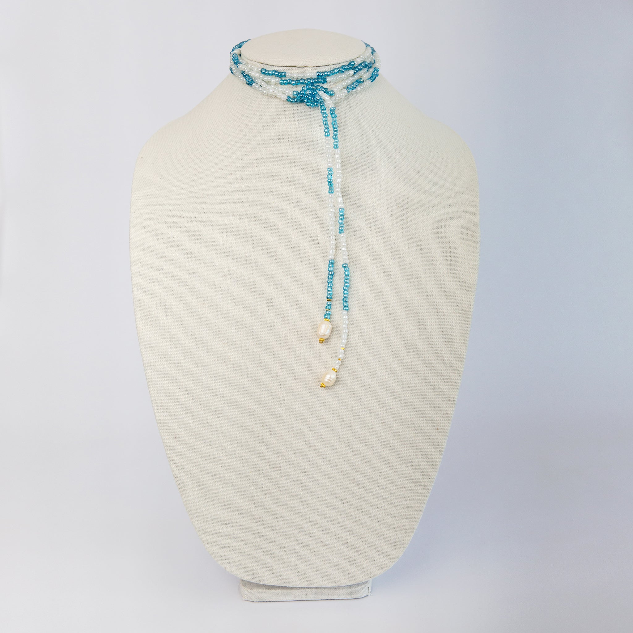 Extra long lariat in blue and satin white glass beads with 2 large fresh water pearls, coordinate this necklace with any ensemble from business casual to everyday wear.