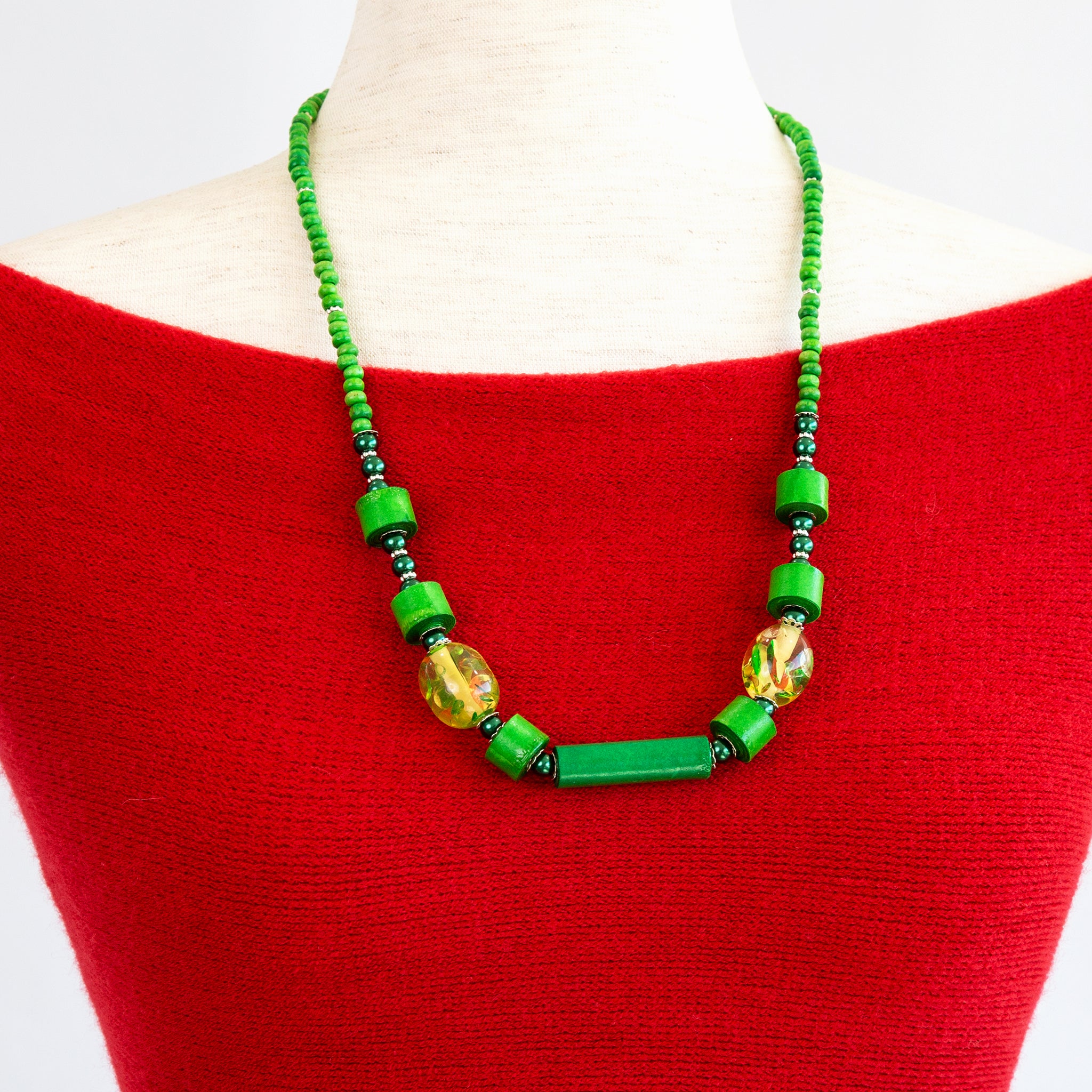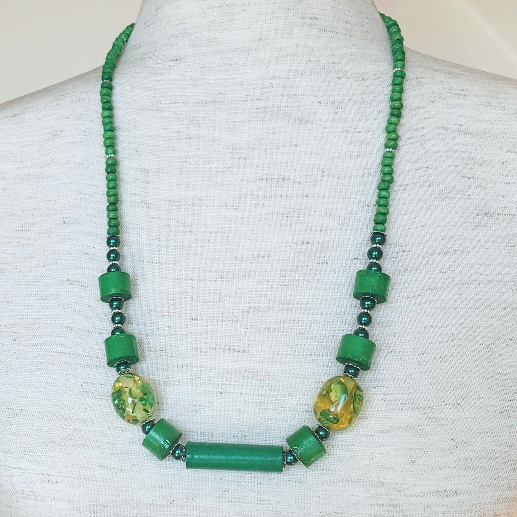 This handmade necklace combines large green cardboard beads, resin and glass beads, clasp and extender. This necklace stands beautifully on its own or pairs wonderfully with longer pieces!