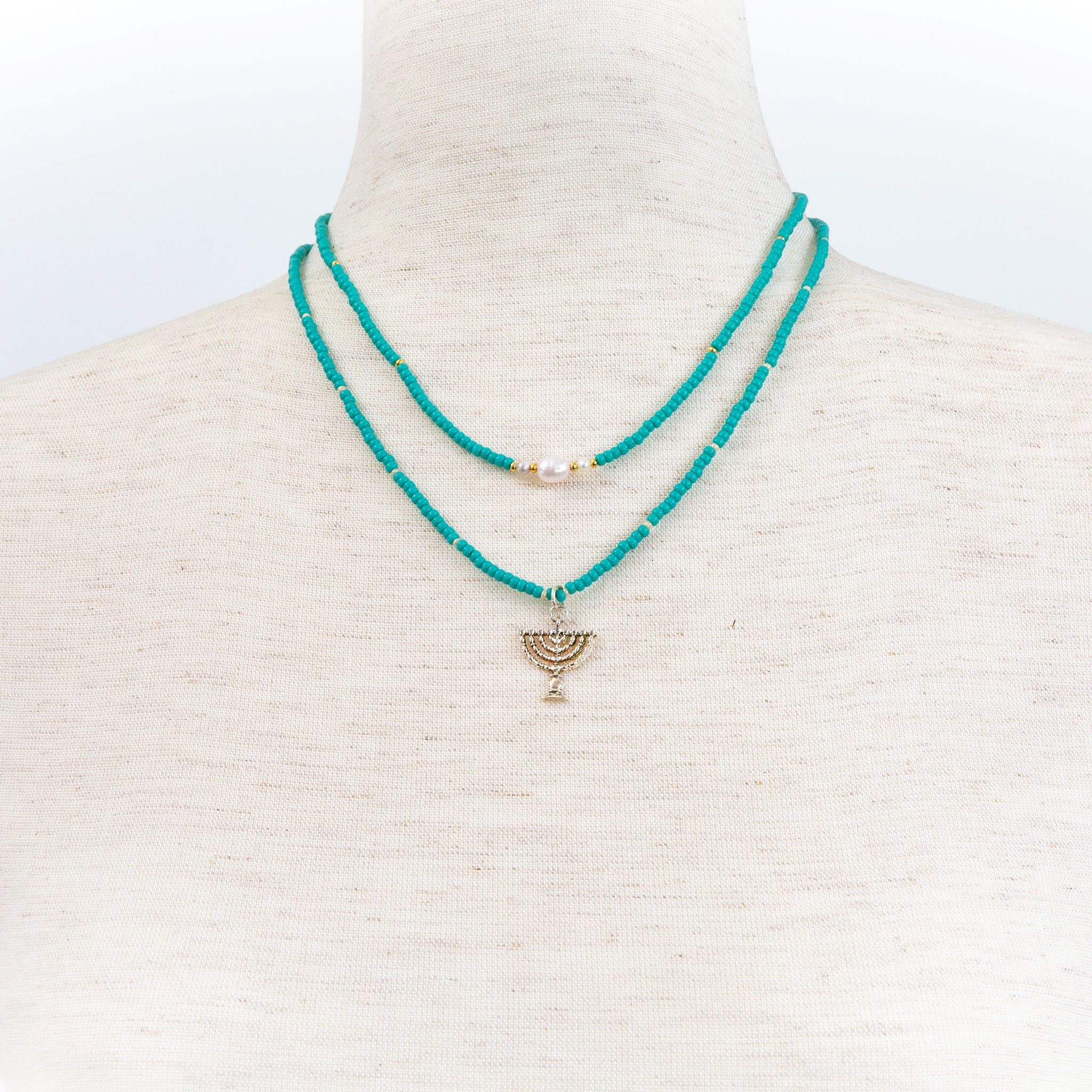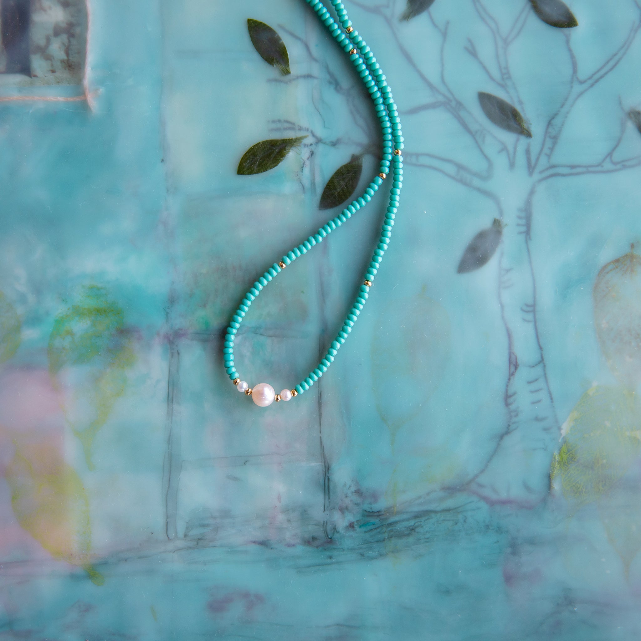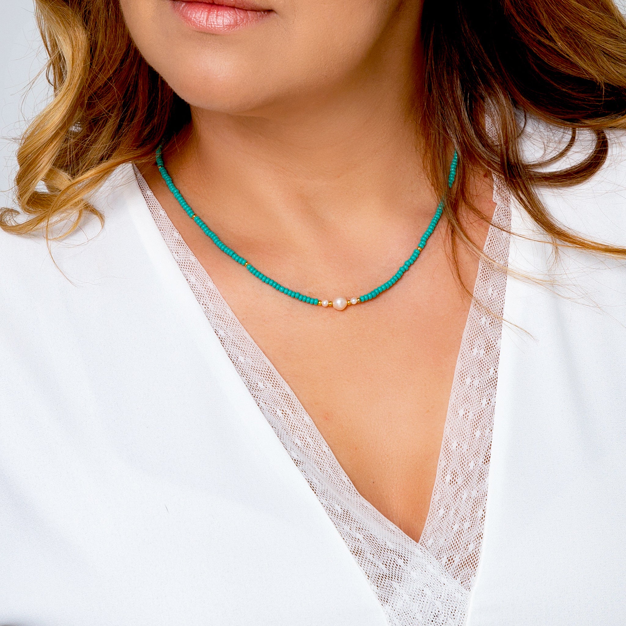 Turquoise color beads, gold tone spacers, 3 fresh water pearls.
