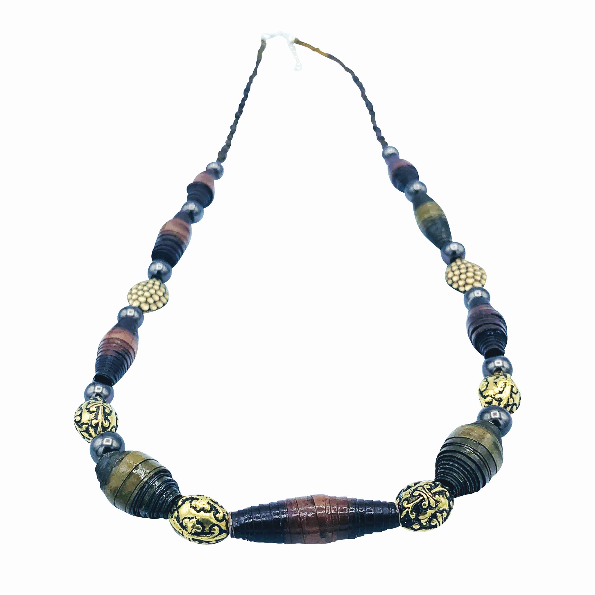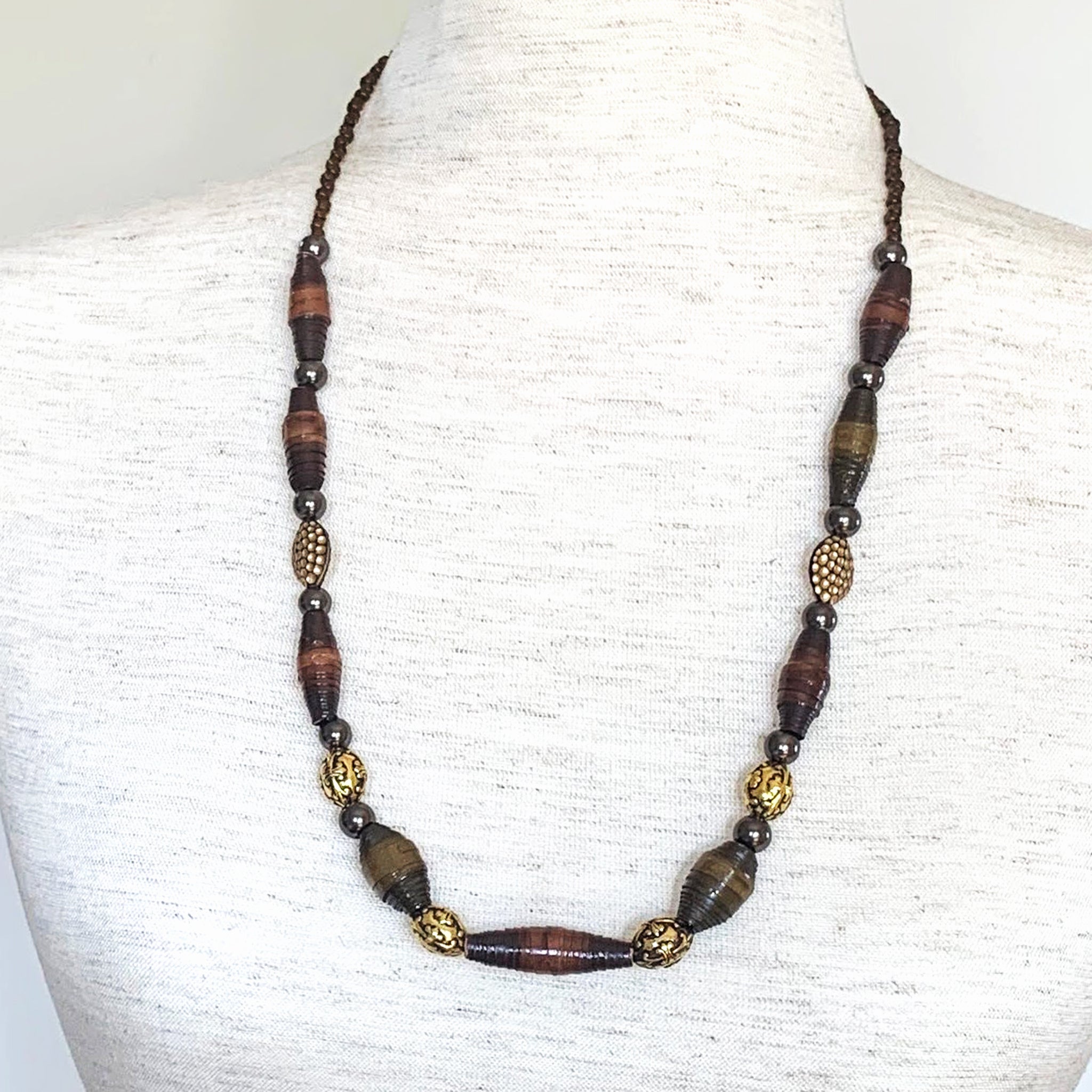 This hues of brown elegant necklace made with large brown paper beads, metal and glass beads, silver clasp with chain extension. This necklace stands beautifully on its own or pairs wonderfully with longer pieces!