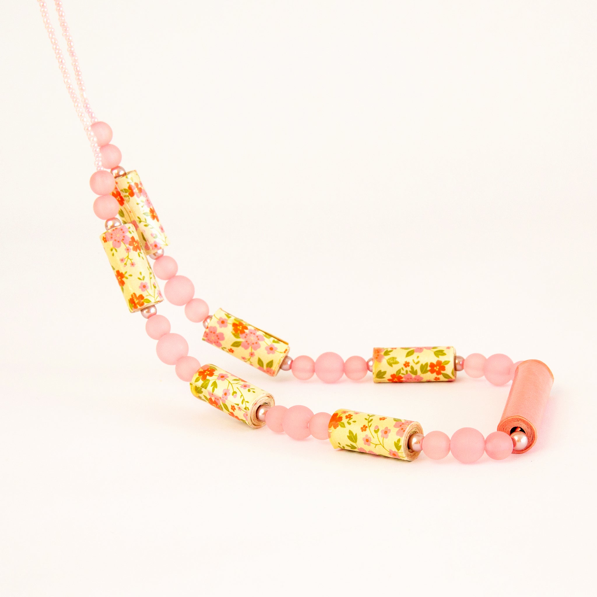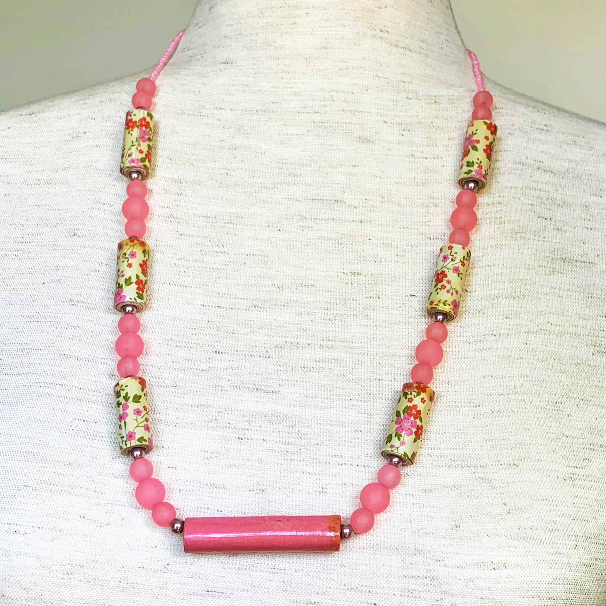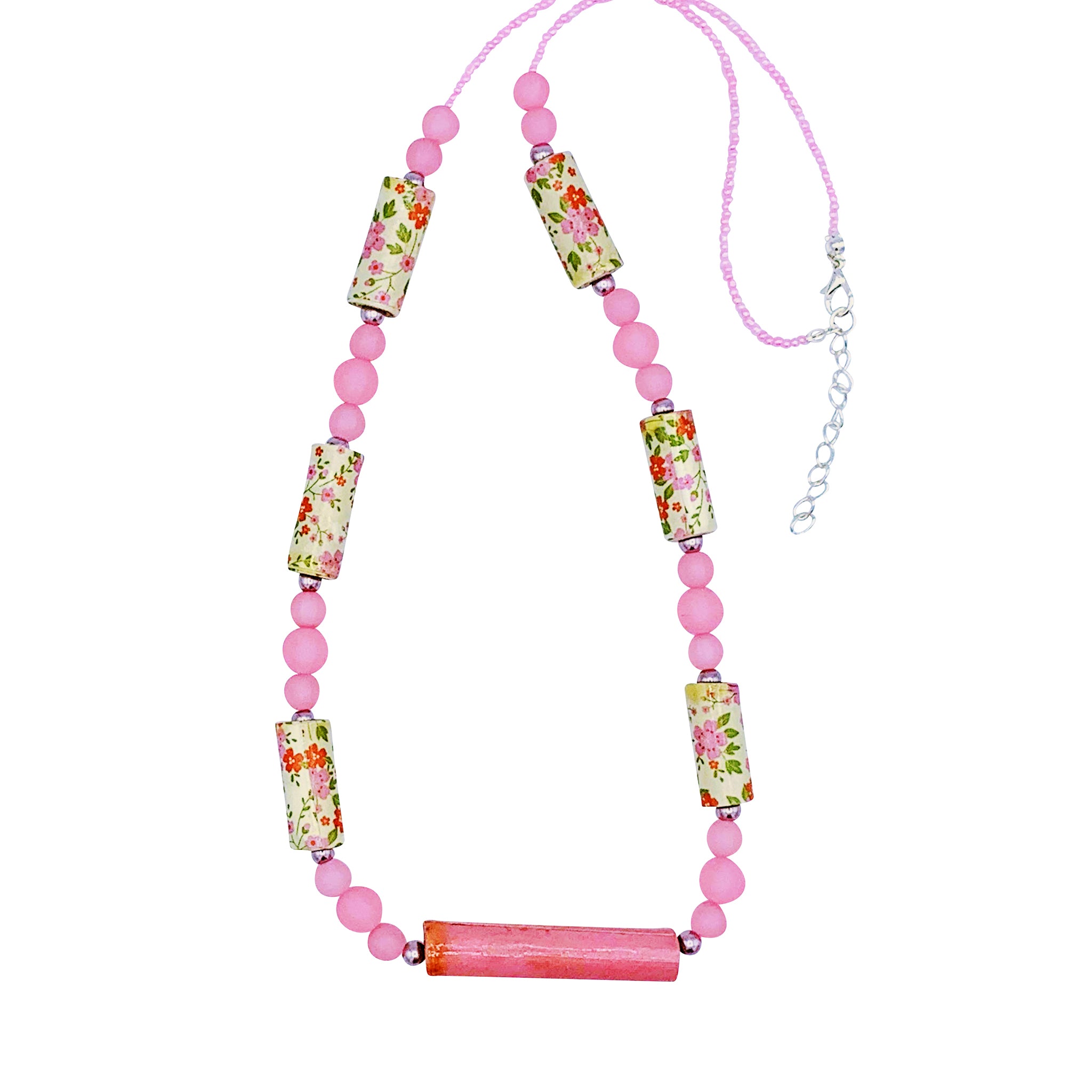 Beautiful paper beads in pink with floral motif combined with glass and resin beads in beautiful hues of pink. Silver clasp with extension. Handcrafted with love. Wear it proudly knowing that your purchase helps the needy in Israel.