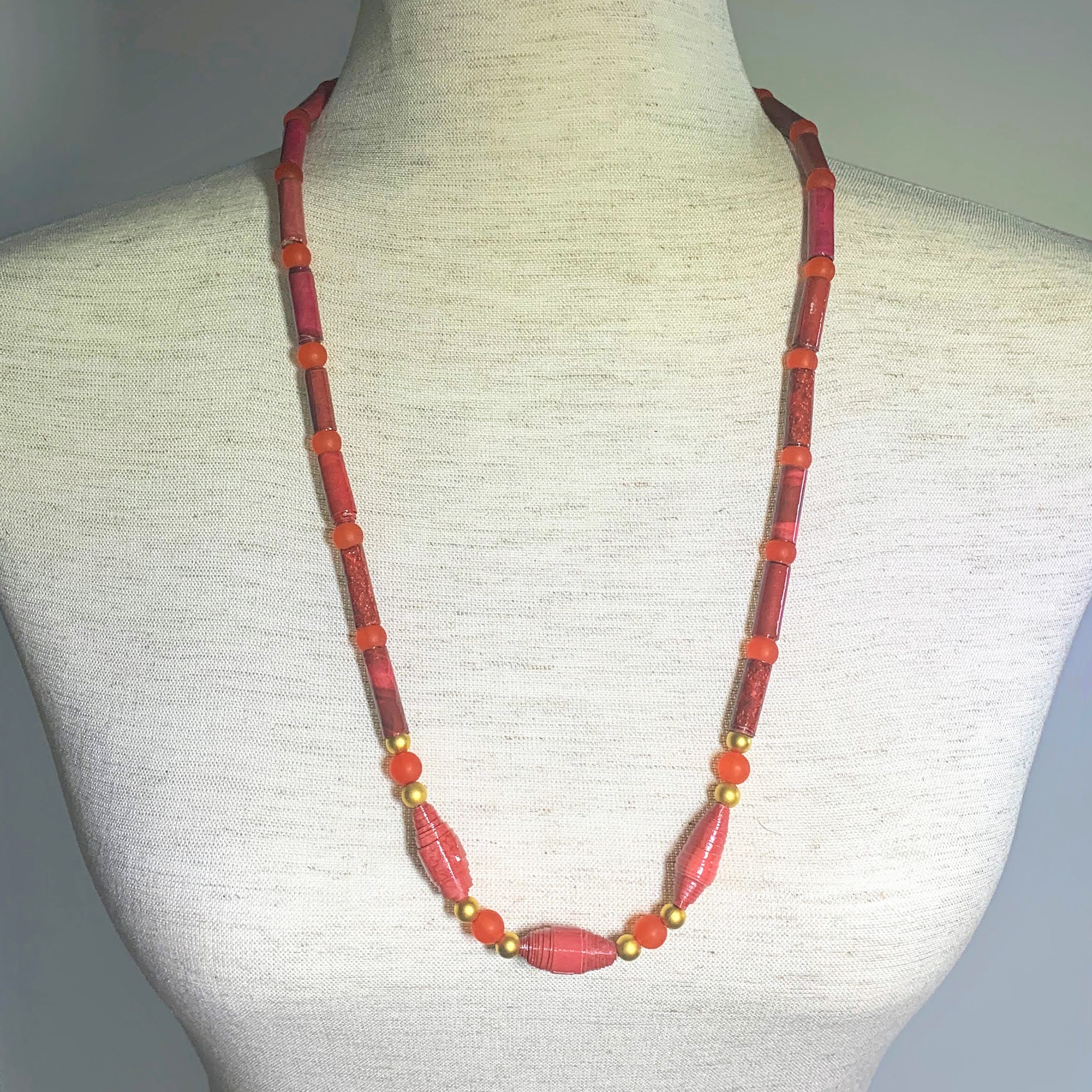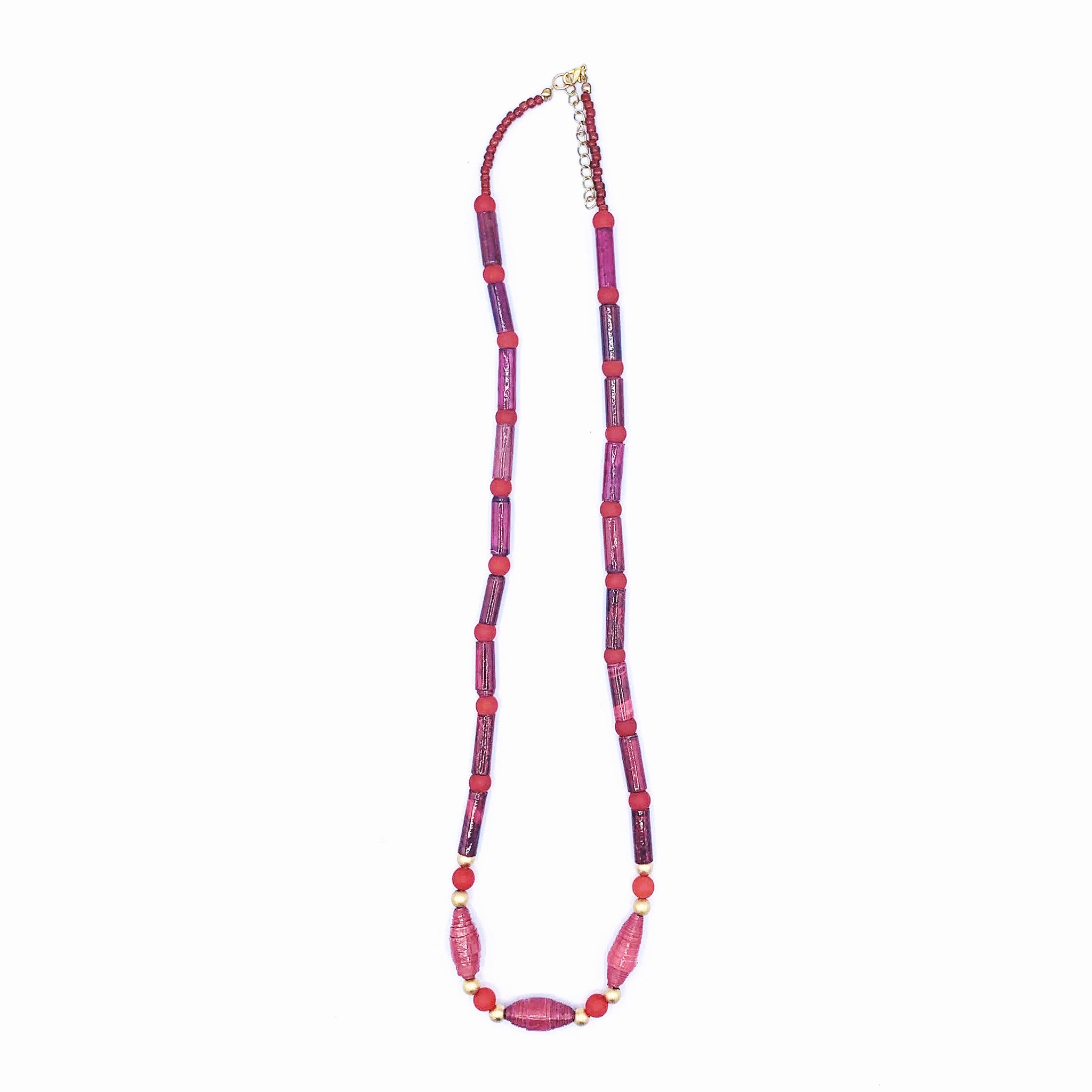 A medley of dark red paper beads and glass beads in a variety of shapes and sizes made into a stylish accessory with a sophisticated feel. With clasp and extender. This necklace stands beautifully on its own or pairs wonderfully with longer pieces!