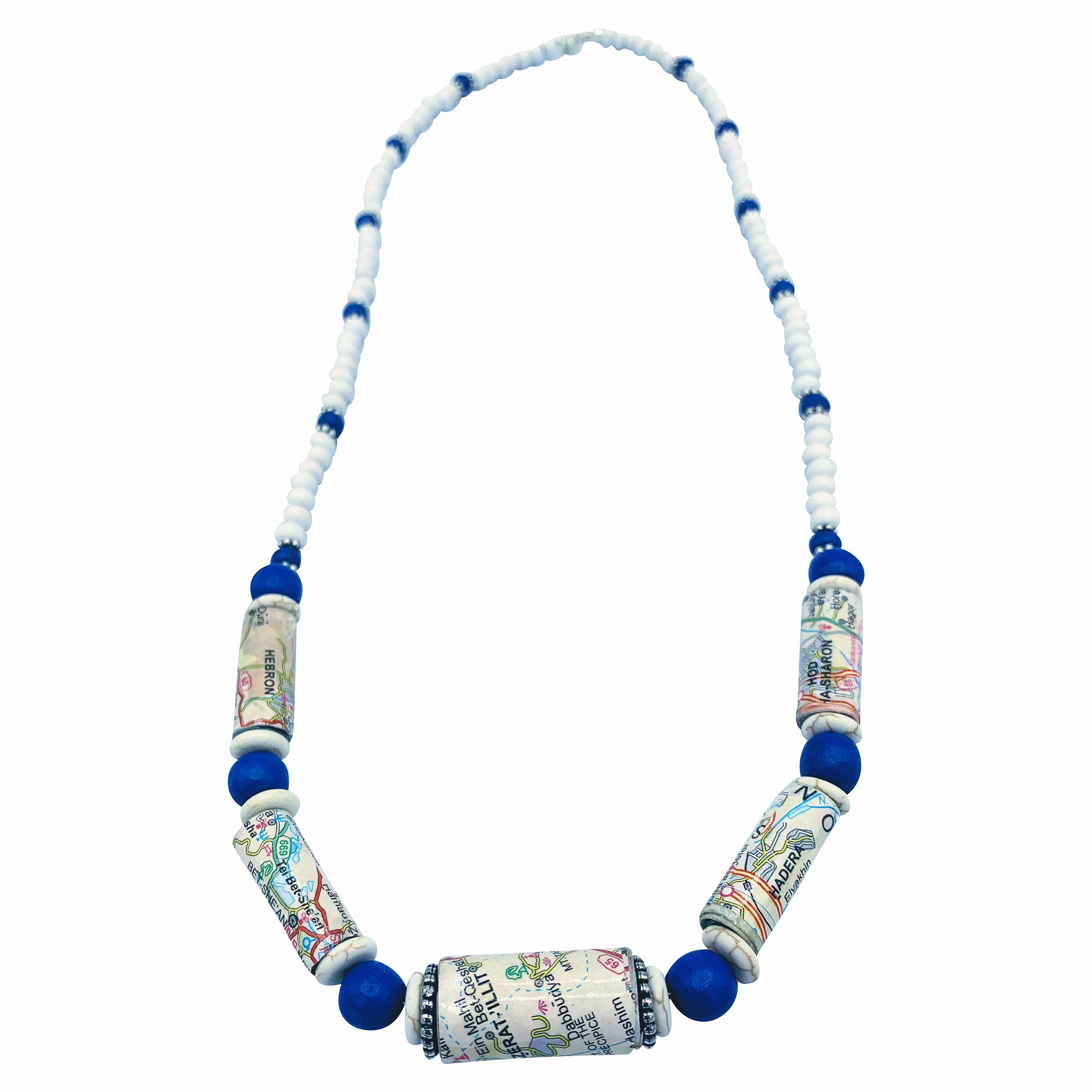 The Map Israel Necklace, center bead Nazareth. Paper beads combined with blue wood beads and white glass beads, clasp with extender, Simply a great conversation piece.