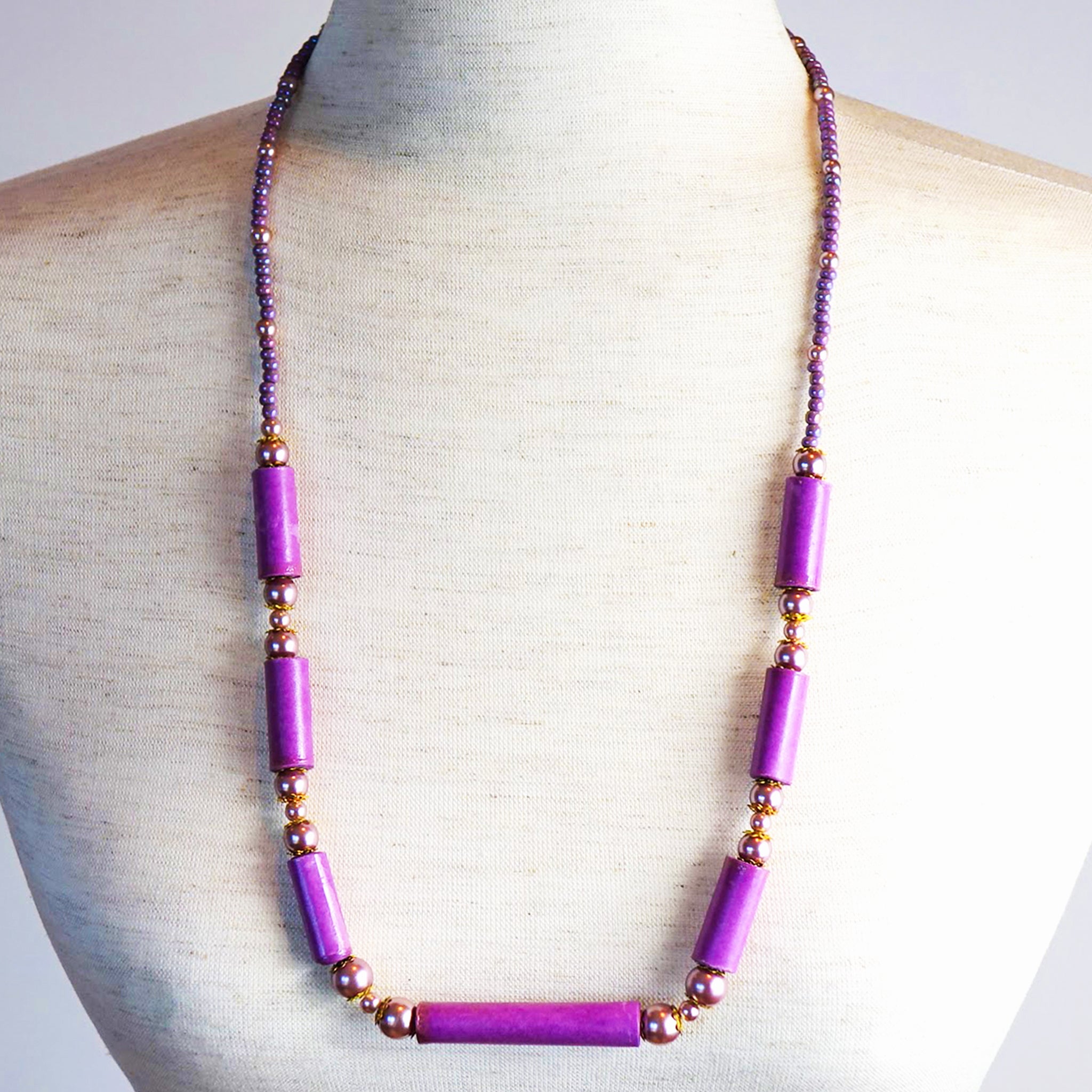 Handmade! This exclusive lively purple necklace is made of paper beads paired with glass pearls, glass beads, a silver clasp with chain extension. Each piece is unique just like you.