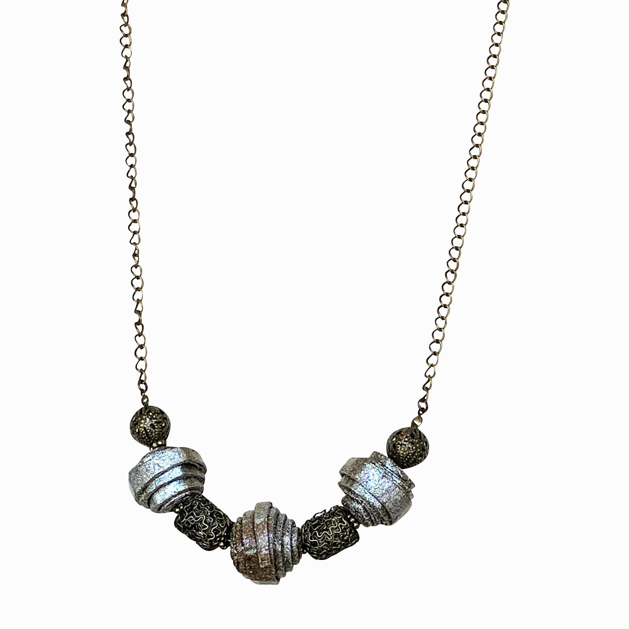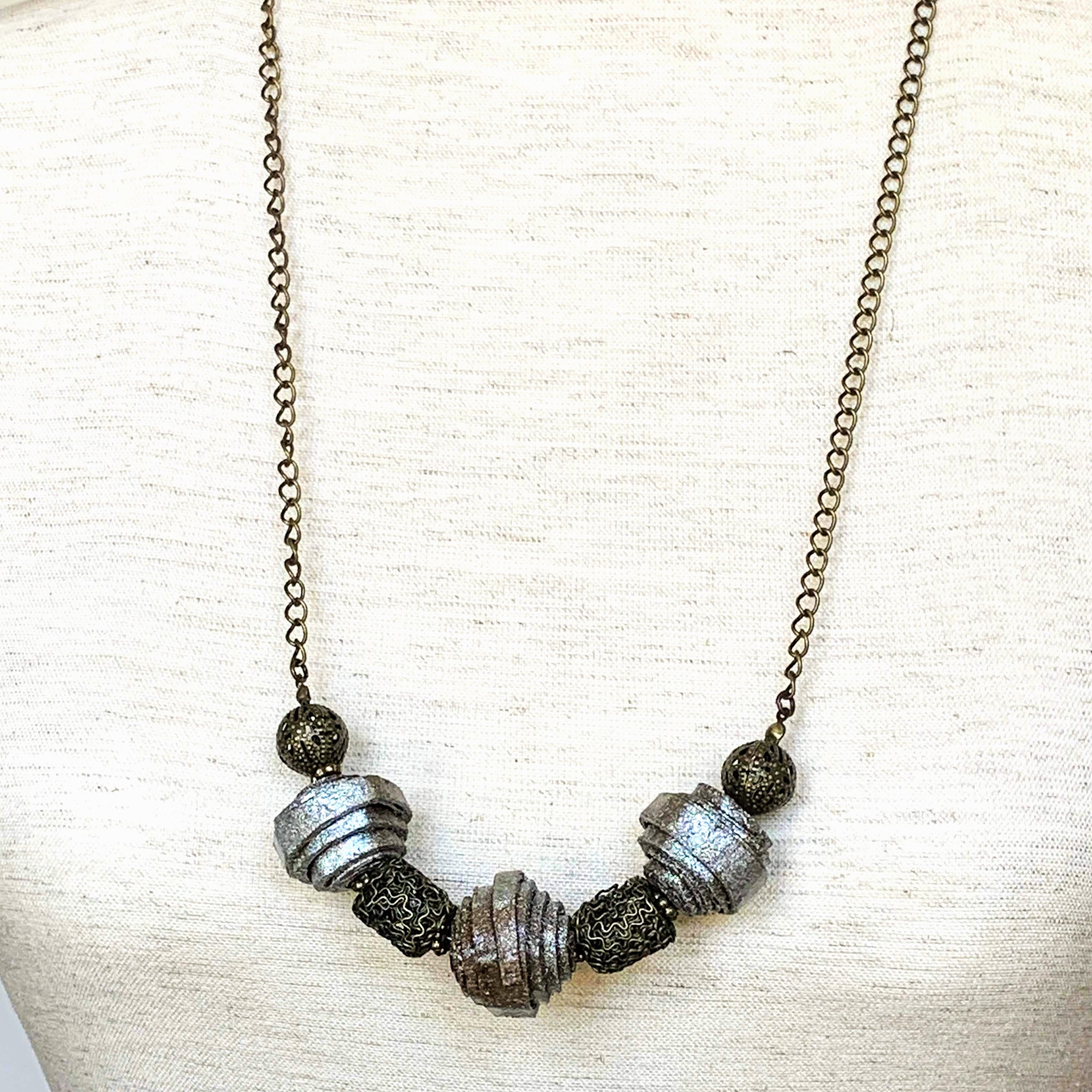 Large silver cardboard beads with metal beads in a long chain is perfect to dress up any outfit. Handcrafted with love, you can wear it proudly knowing your purchase helps the needy in Israel. Easy to mix and match with your attires.
