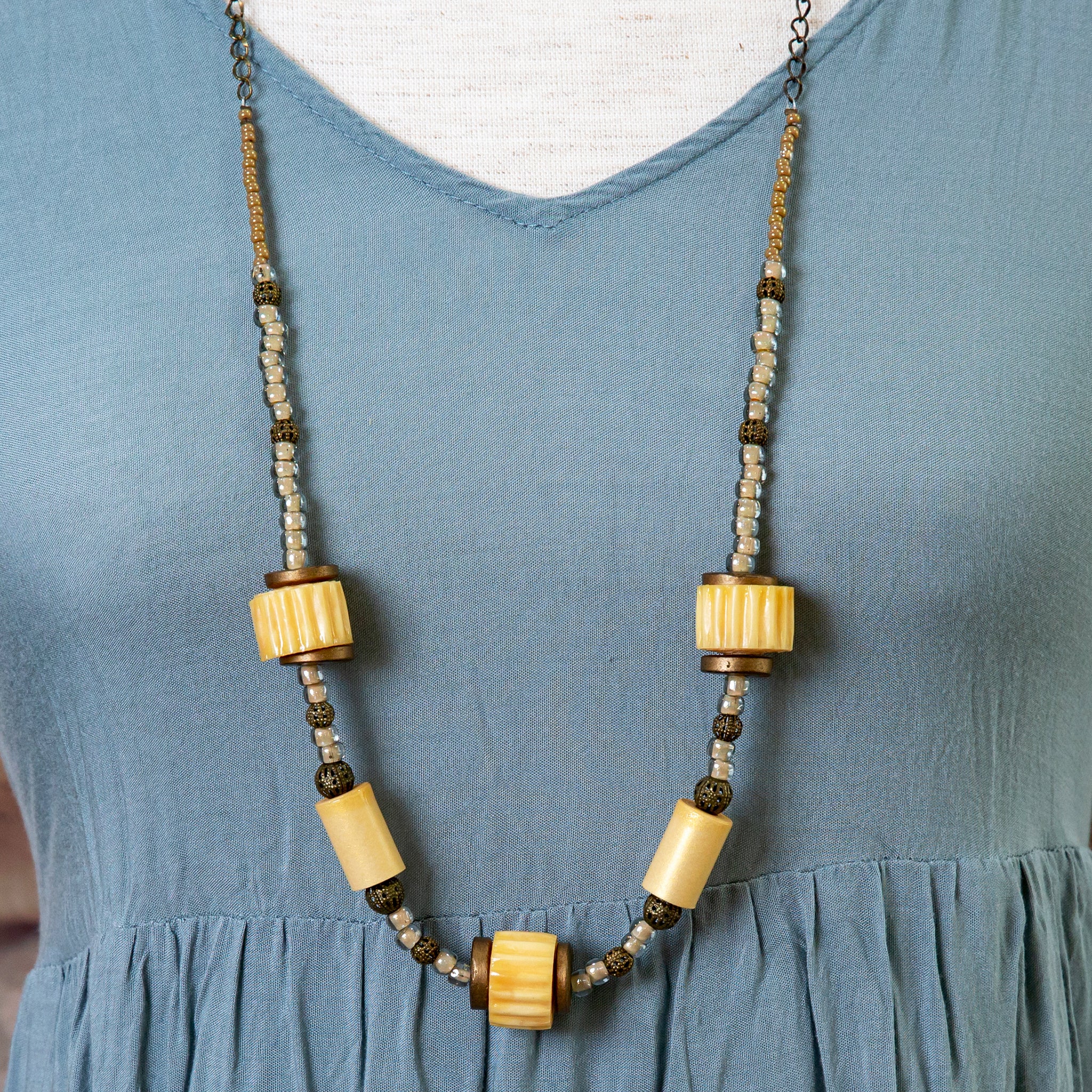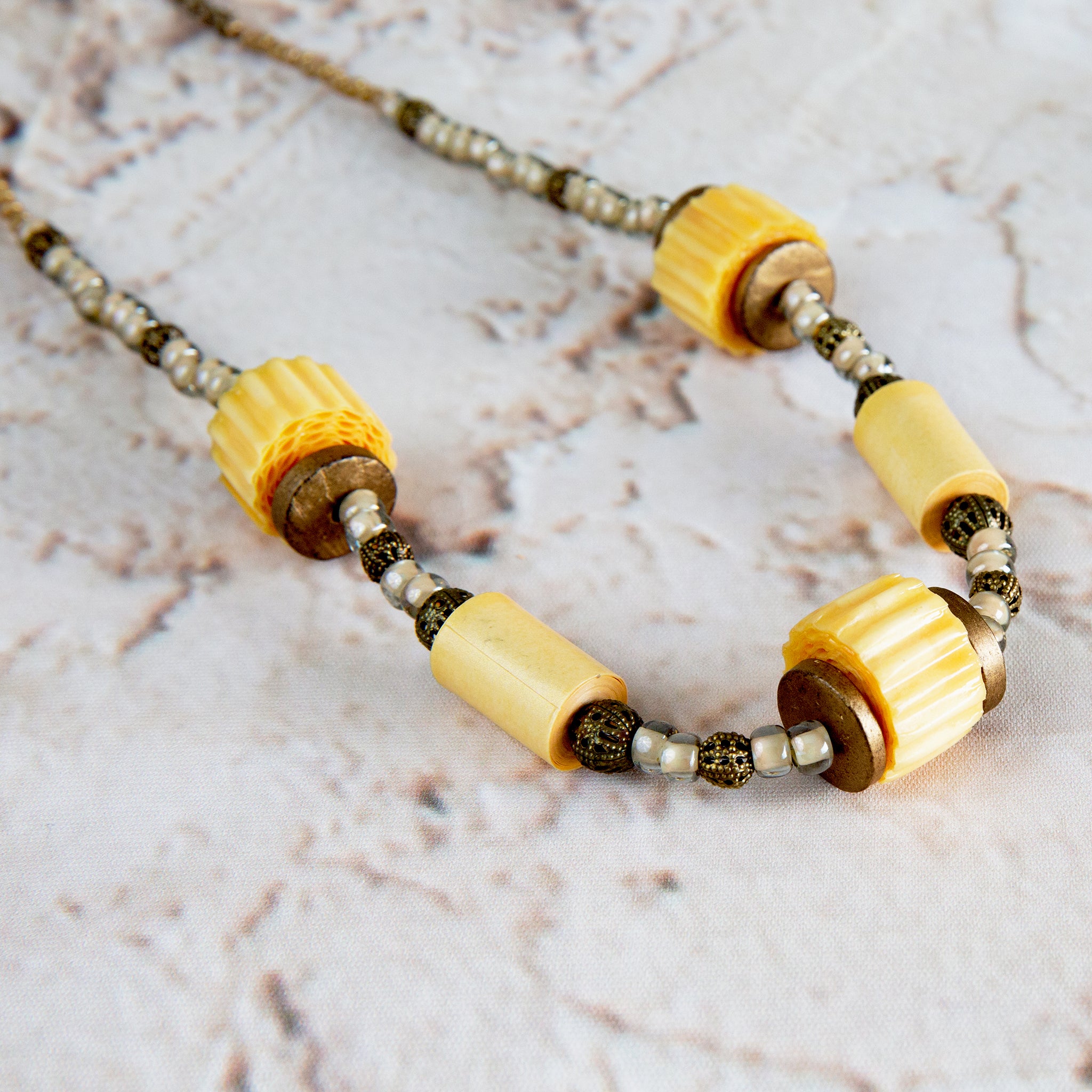 Light yellow corrugated cardboard beads with silver glass beads, metal spacers and old gold chain