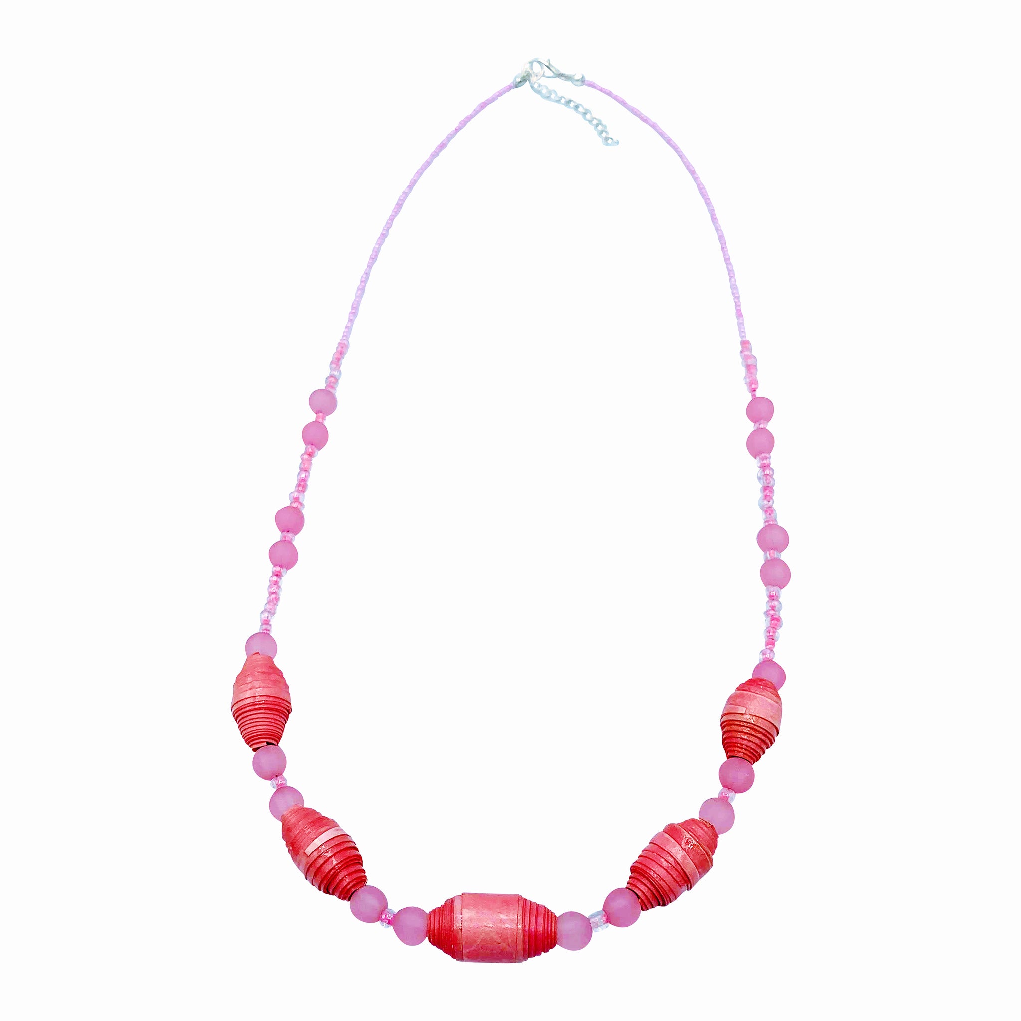 Unique pieces that we love, in an eclectic and versatile selection of styles, this necklace combines hot pink handmade paper beads, resin, and glass beads, a clasp with extender. Unique design for any occasion.
