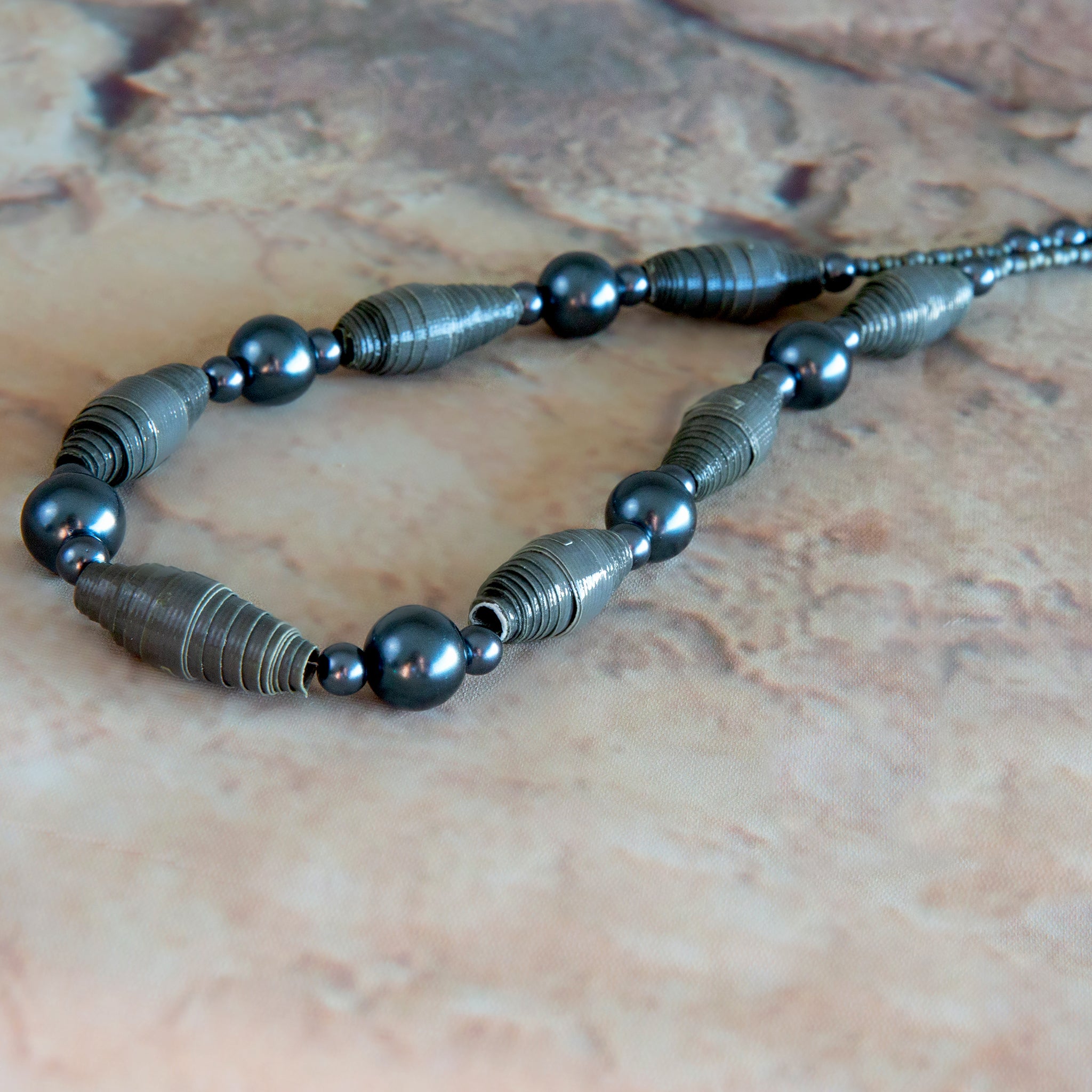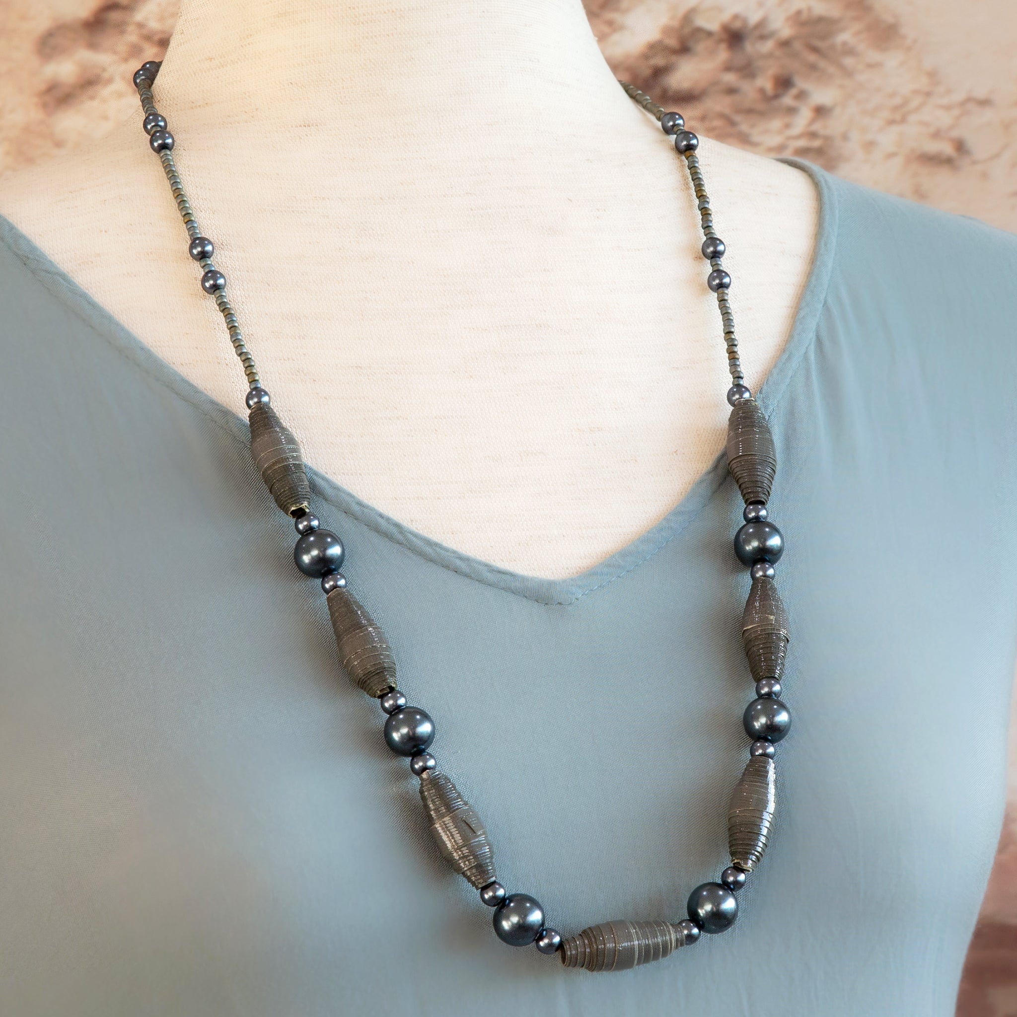 Whether worn as an accessory or as a statement style of self this beautiful handmade silver hues elegant necklace shows your bold style. Elegant single-stranded necklace with silver Hues paper beads, glass pearls, and glass beads, silver clasp and chain extension.