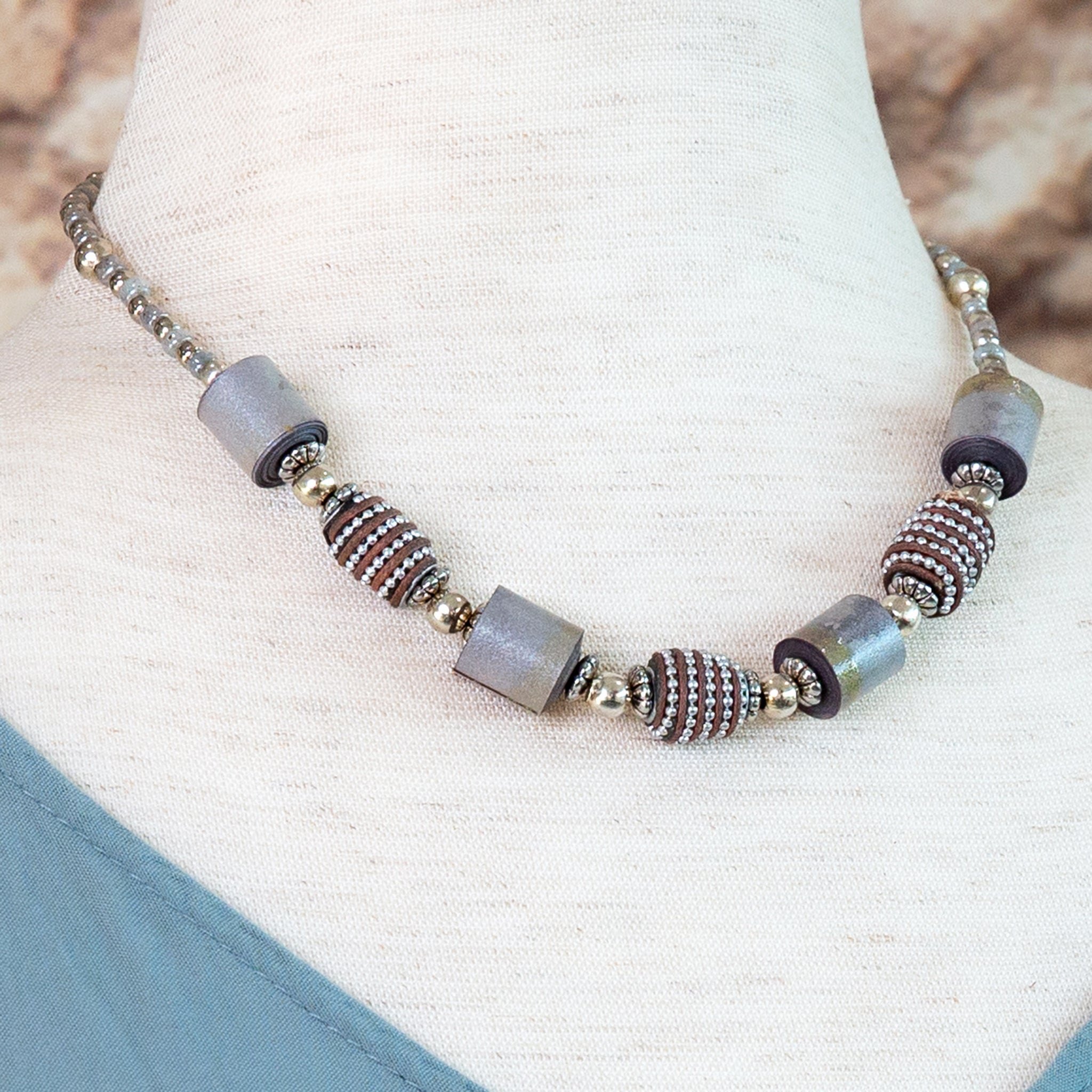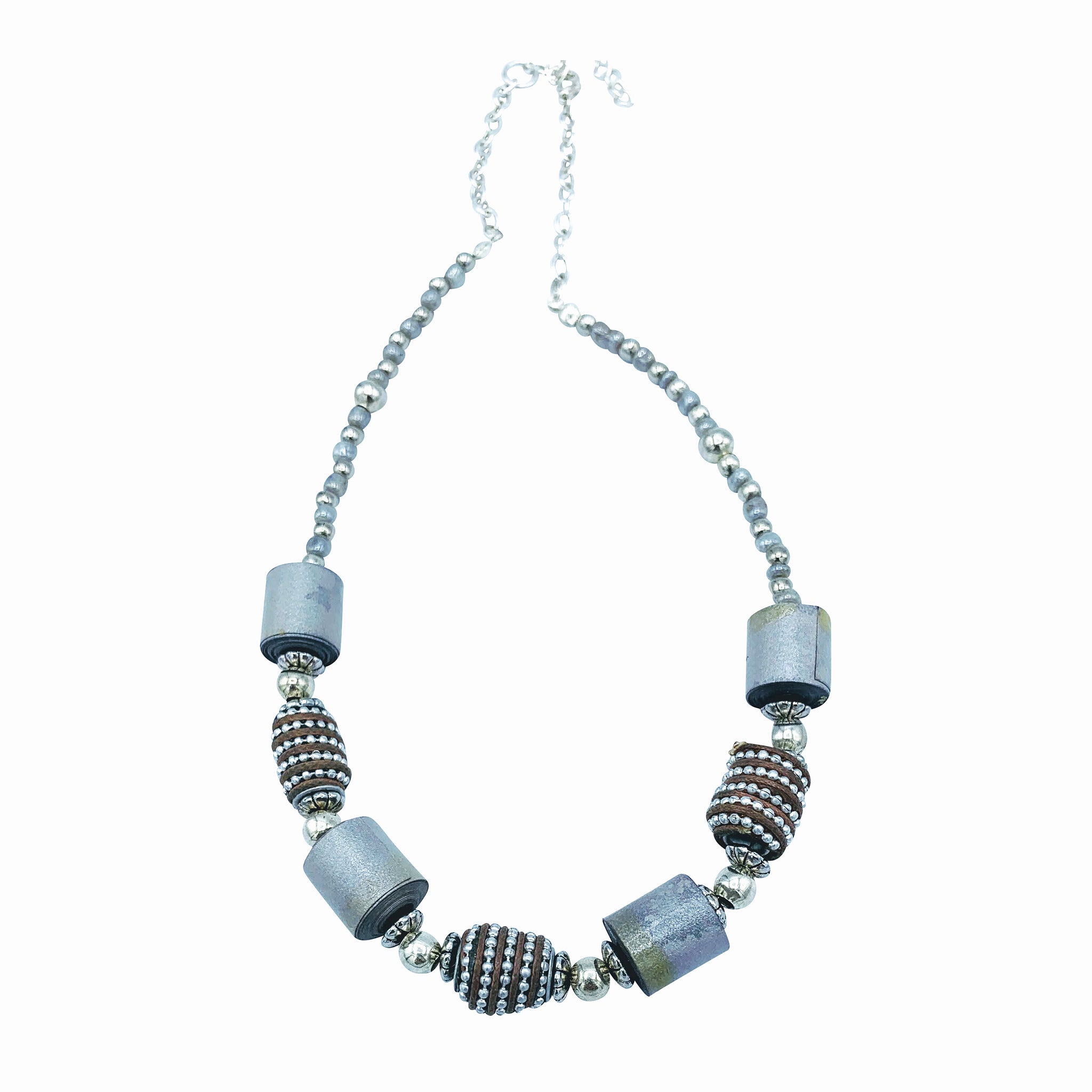 Elegant, handmade necklace combines paper beads in a mixed media style, with silver clasp and chain extension. A stunning style statement and a polished take on modern jewelry.