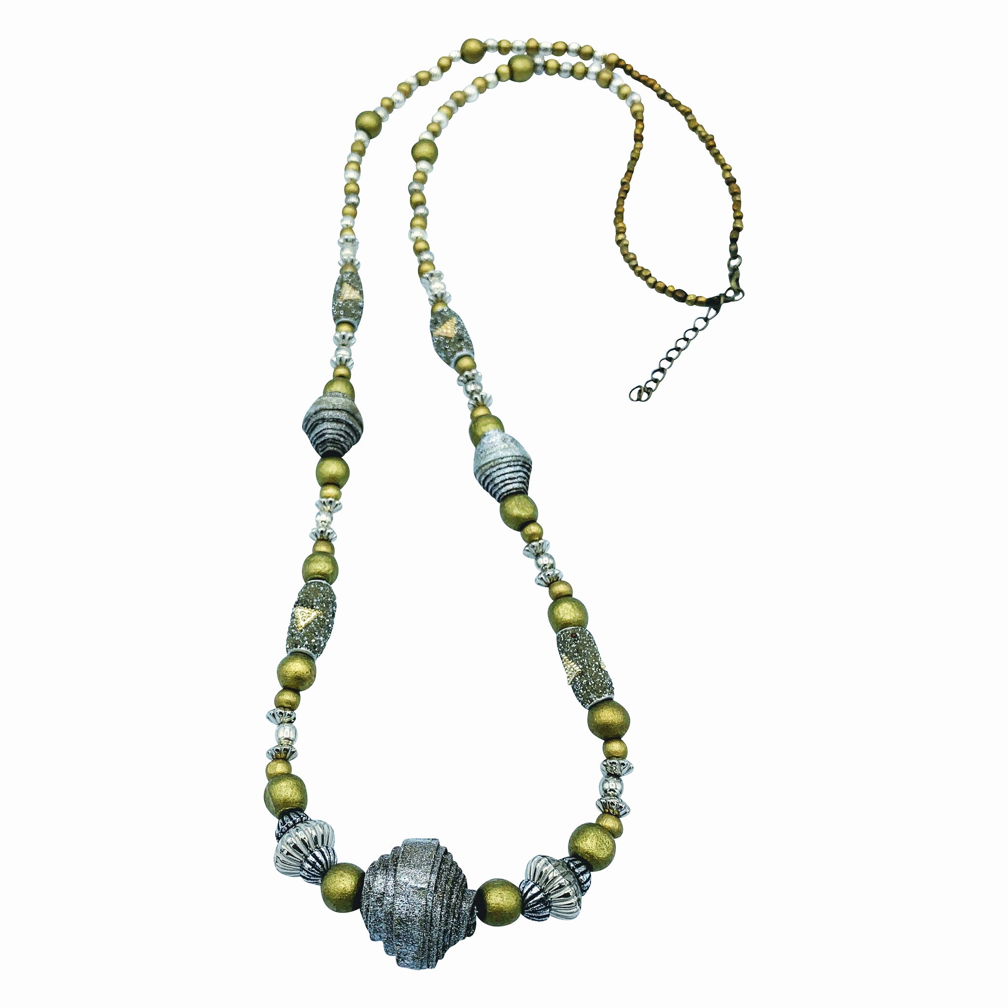 This statement necklace can go from dressy to casual with many different colored outfits. The necklace combines large paper beads complemented with various stylish beads. A stunning style statement and a polished take on modern jewelry.