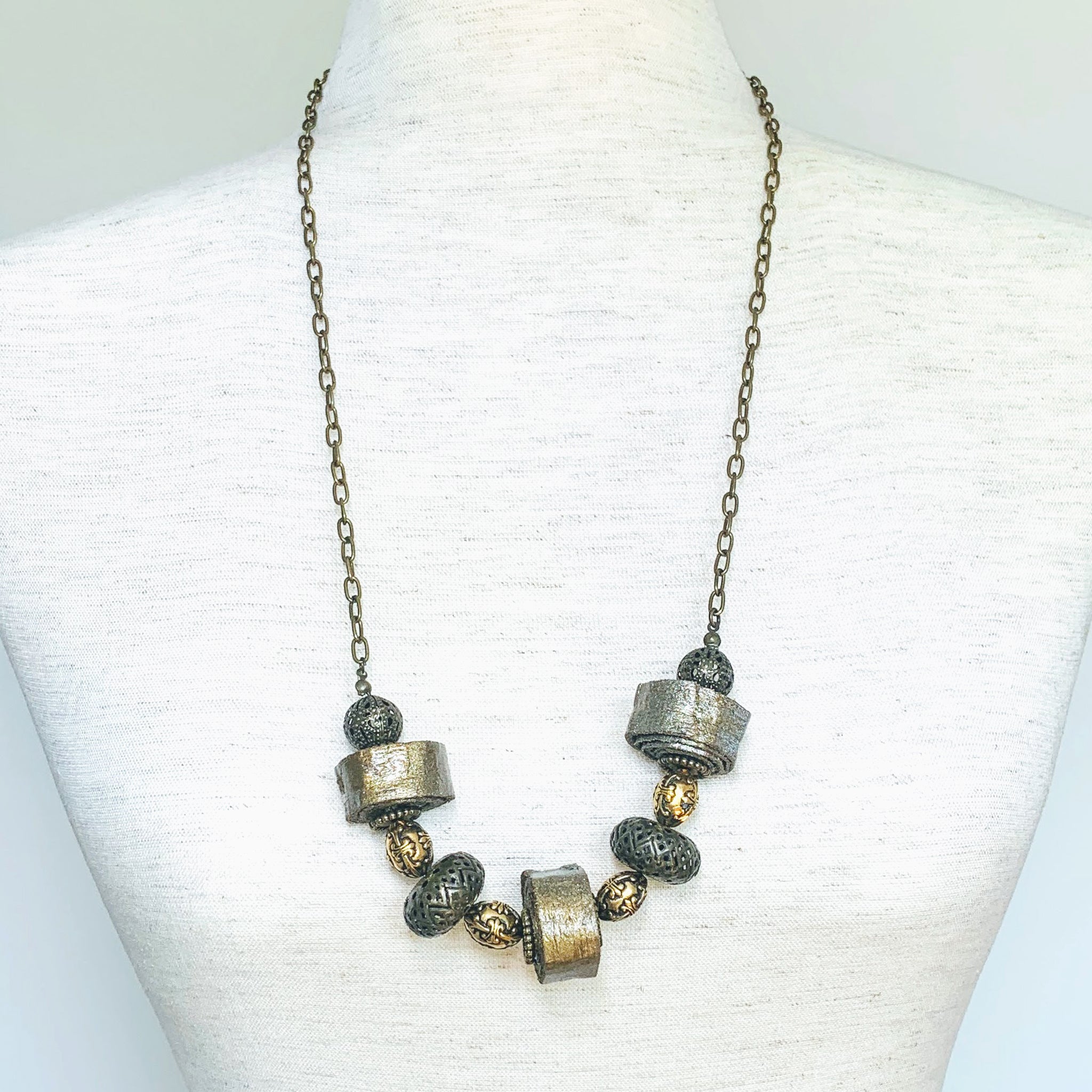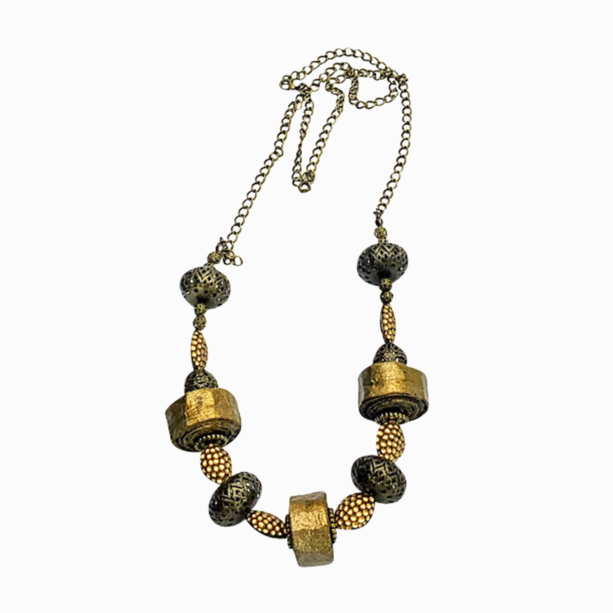 The exquisite necklace combines large cardboard beads handpainted in old gold, large metal beads, and a long-chain, measures. An excellent addition to your wardrobe.