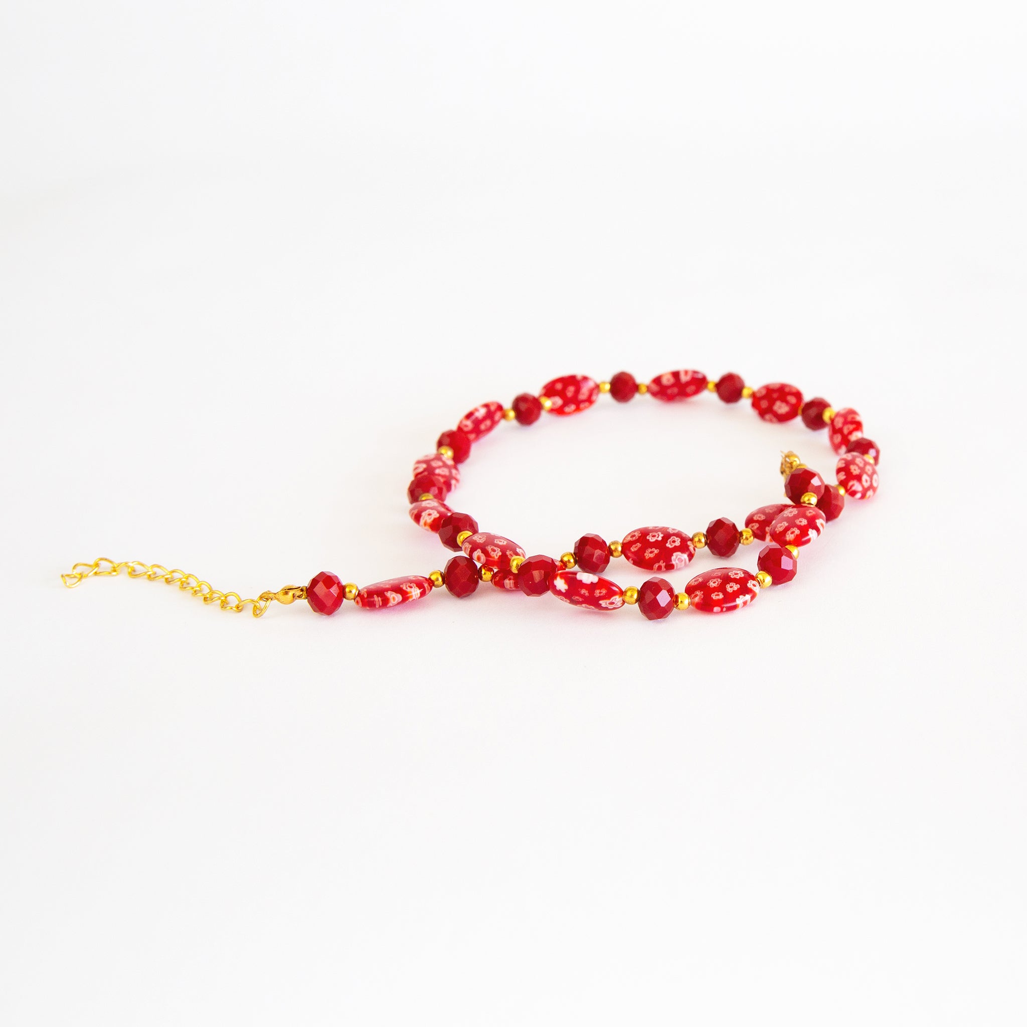 Red millefiori oval beads, faceted crimson and gold spacer beads, clasp and extension